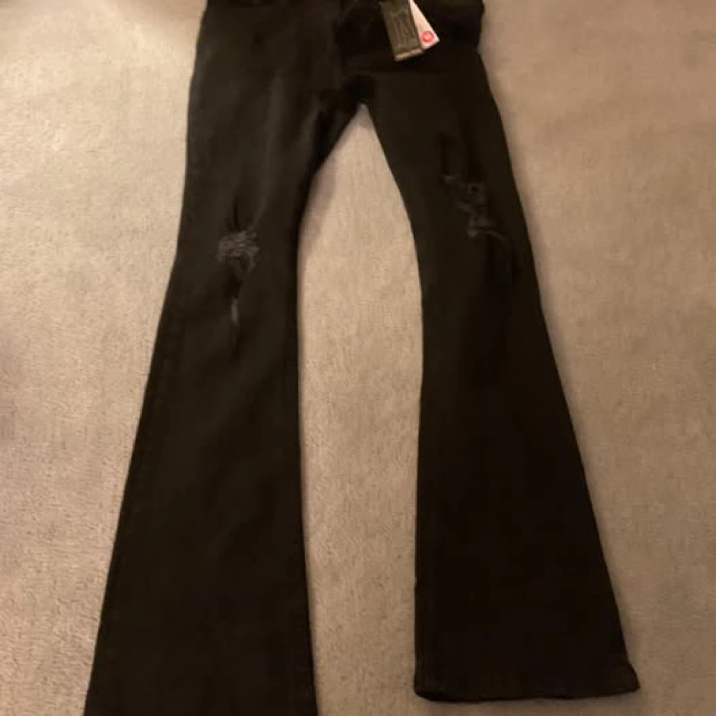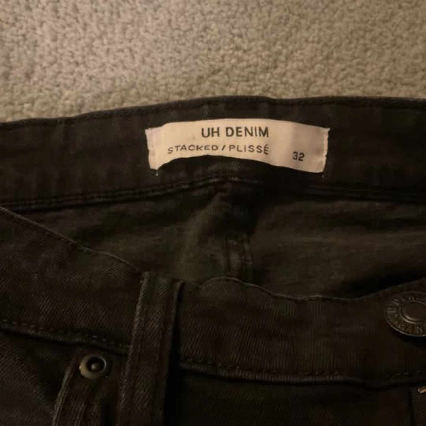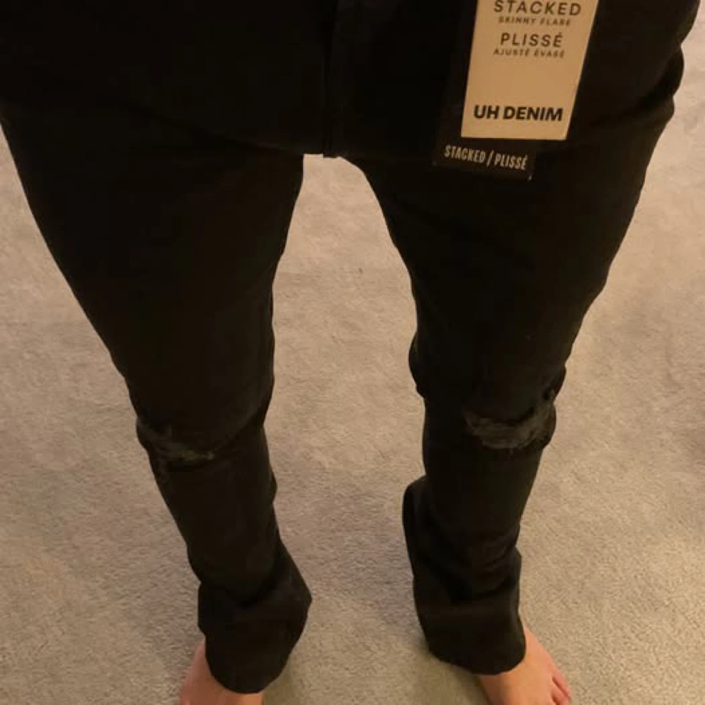 These black UH DENIM jeans feature a stacked skinny flare fit. They are a size 32 with ripped detailing on the knees. These pants are designed with a plissé adjusted hem.