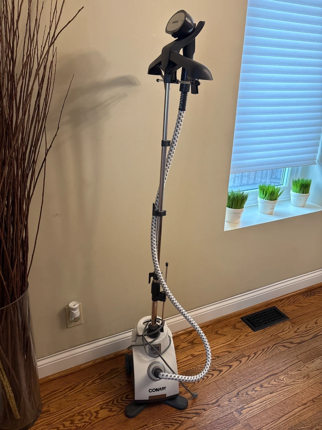 Conair garment steamer for wrinkle-free clothes. It comes with a water tank and a hose for steaming. Handy for refreshing your outfits quickly!