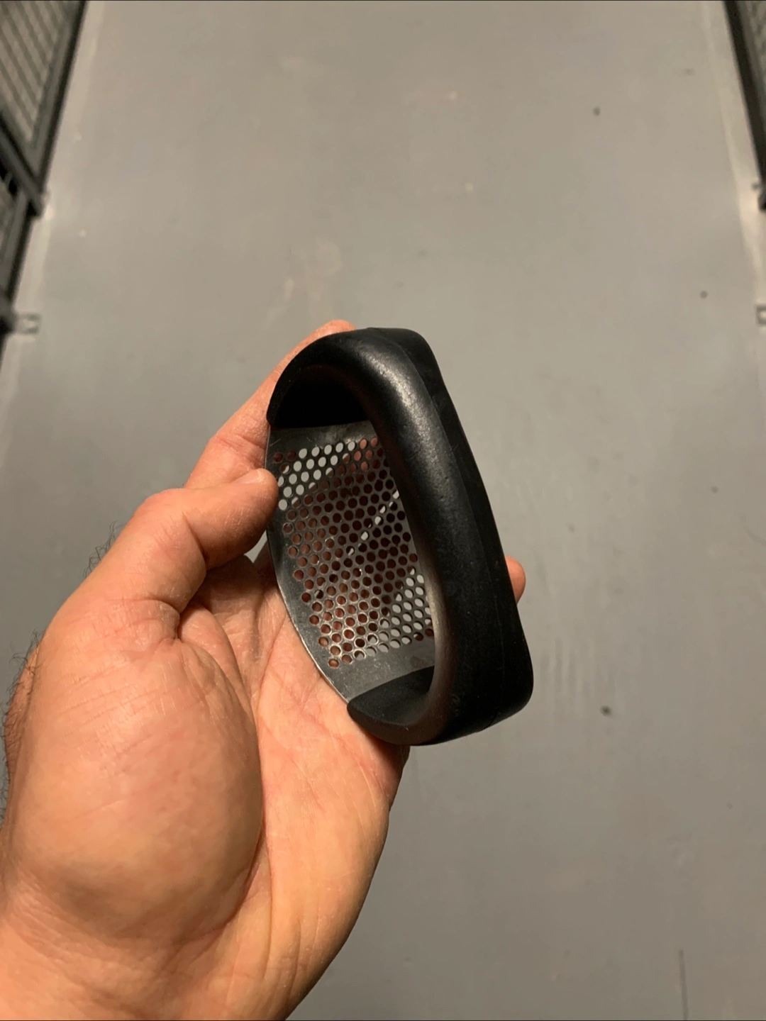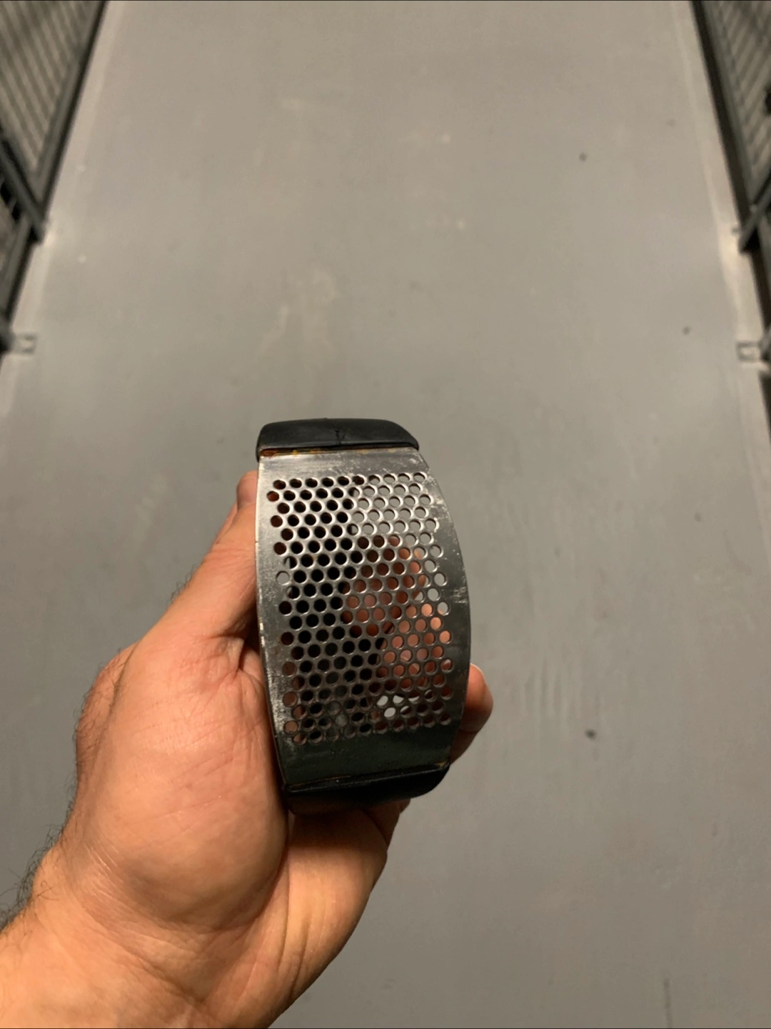 Selling a garlic press in used condition. It has a black handle and a metal pressing surface with small holes. Perfect for mincing garlic quickly and easily!