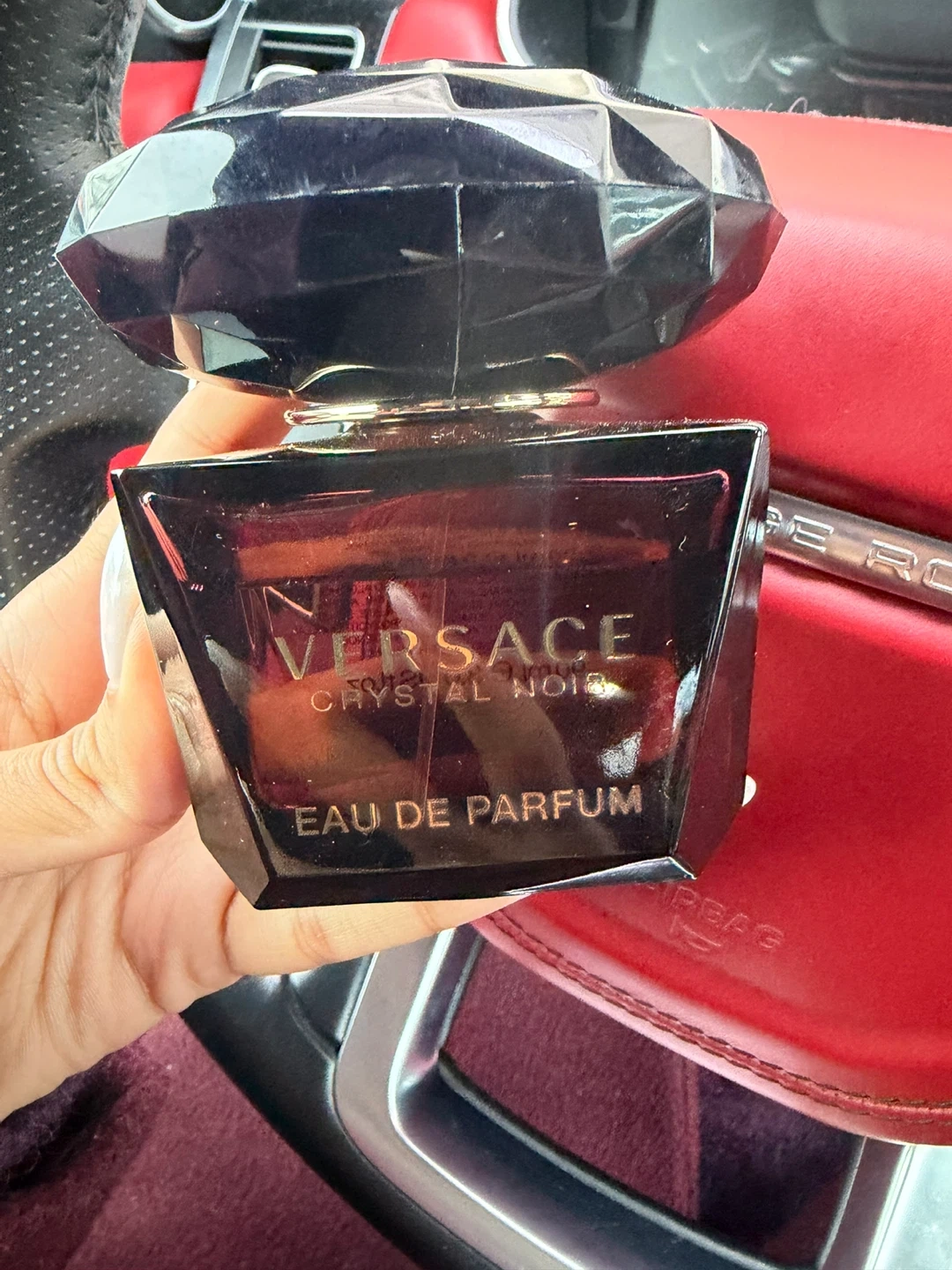 This is Versace Crystal Noir Eau de Parfum. It's a 90ml bottle. The scent has top notes of gardenia, peony, and orange blossom, with heart notes of cardamom, jasmine, and sandalwood, and base notes of amber, musk, and iris.
