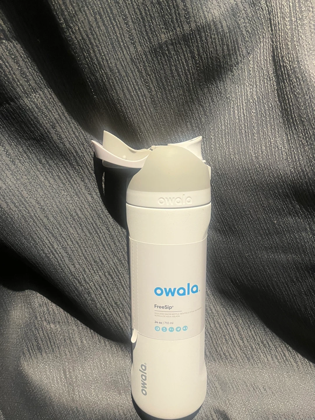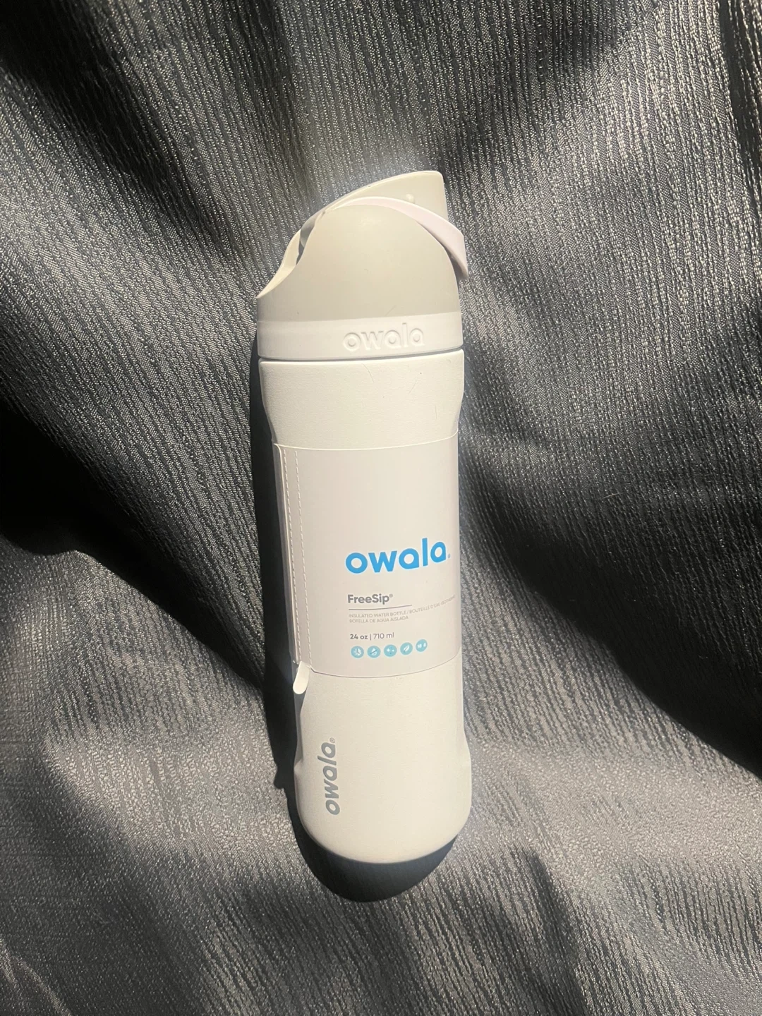 This Owala FreeSip water bottle is white and grey. It's made with a stainless steel interior and has a capacity of 24 oz (710 ml). The FreeSip spout allows for easy drinking.