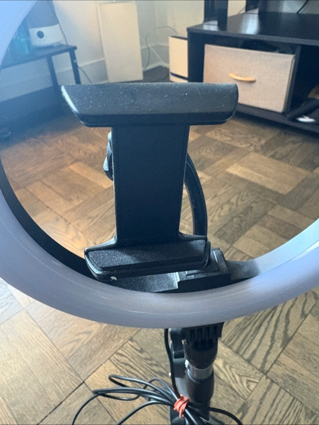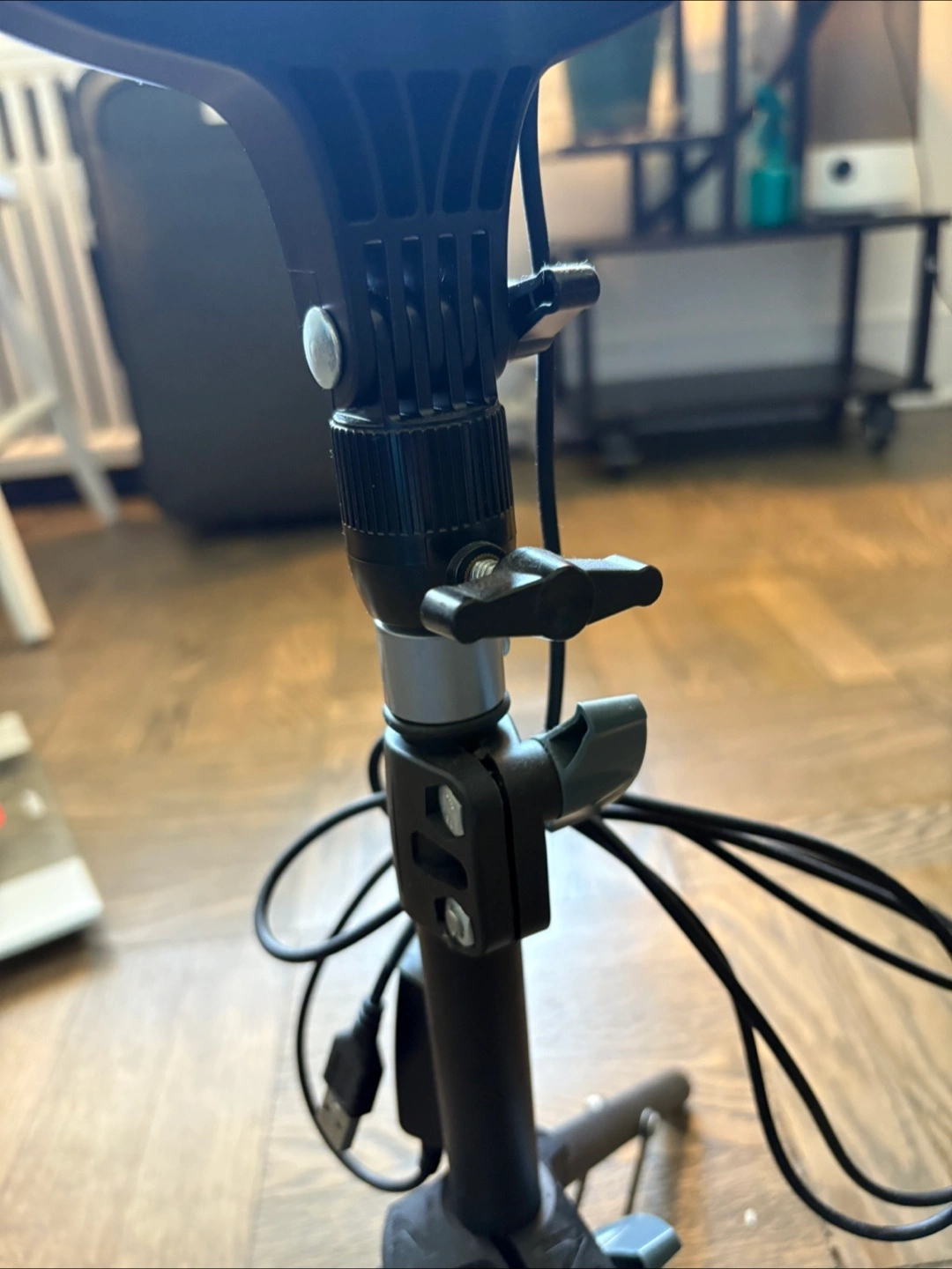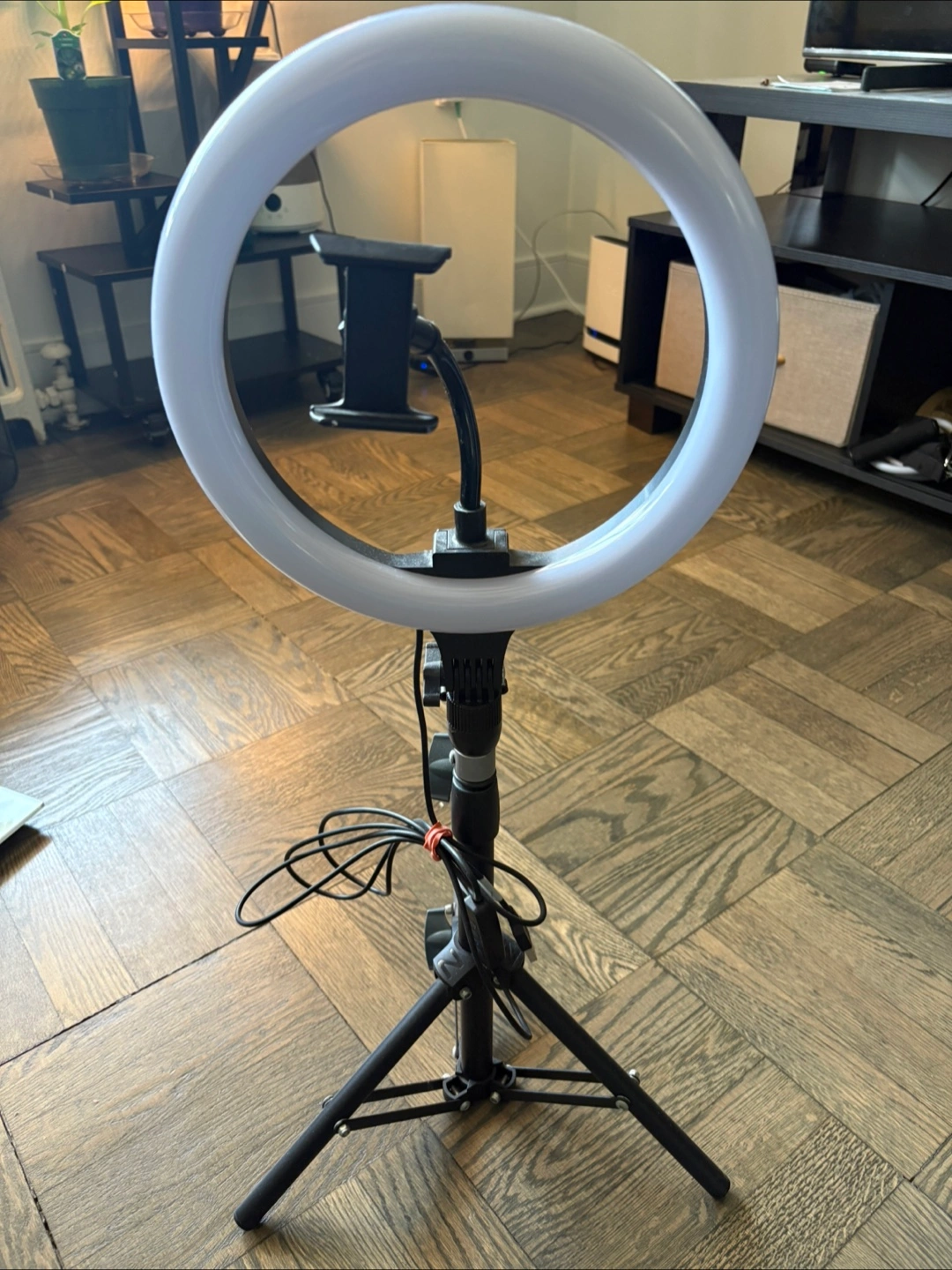 Extandable ring light. Adjustable height up to 34 inch. Includes phone holder. USB powered. Great for selfies, videos, and live streams.