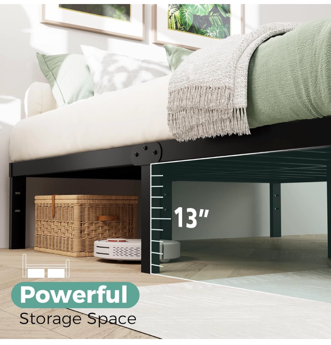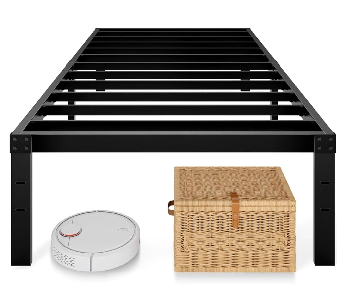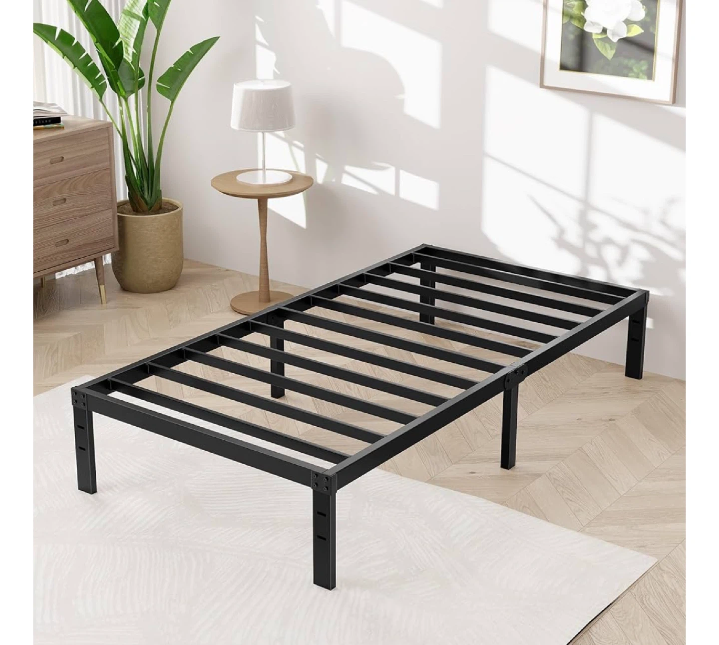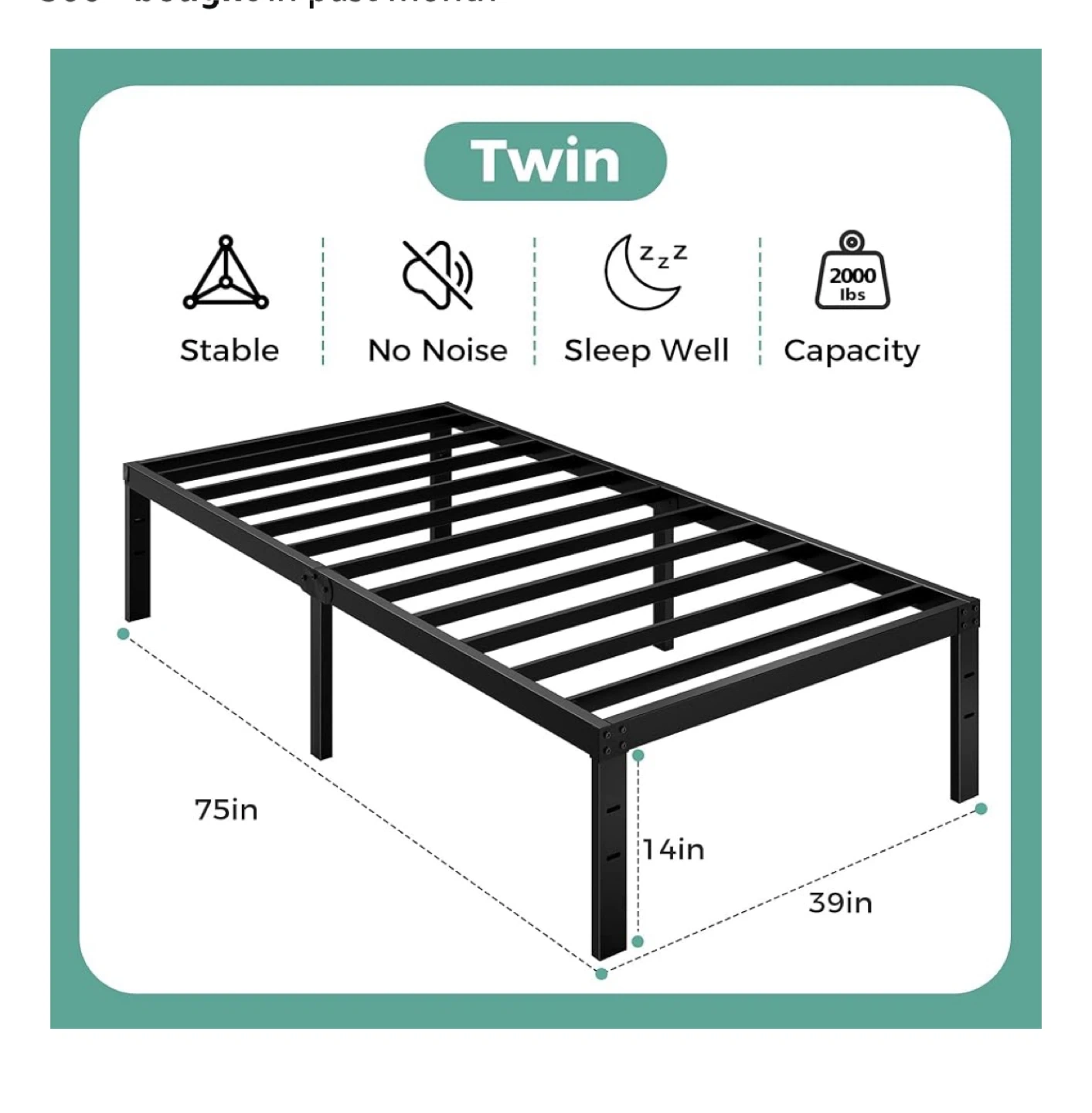 This is a twin-size metal bed frame in black. It's designed to be stable and noise-free, helping you sleep well. The frame offers a powerful storage space with 13 inches of clearance underneath. It measures 75 inches in length and 39 inches in width, with a height of 14 inches.