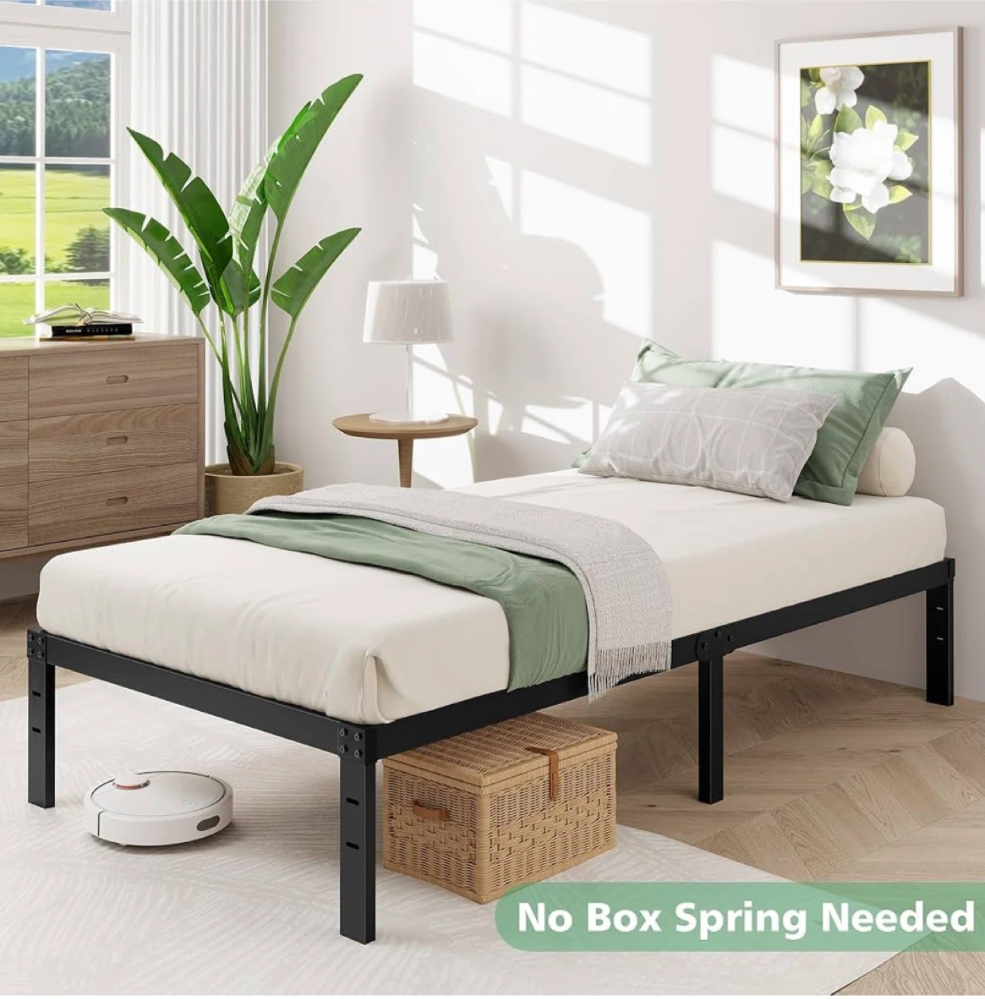 This is a twin-size metal bed frame in black. It's designed to be stable and noise-free, helping you sleep well. The frame offers a powerful storage space with 13 inches of clearance underneath. It measures 75 inches in length and 39 inches in width, with a height of 14 inches.