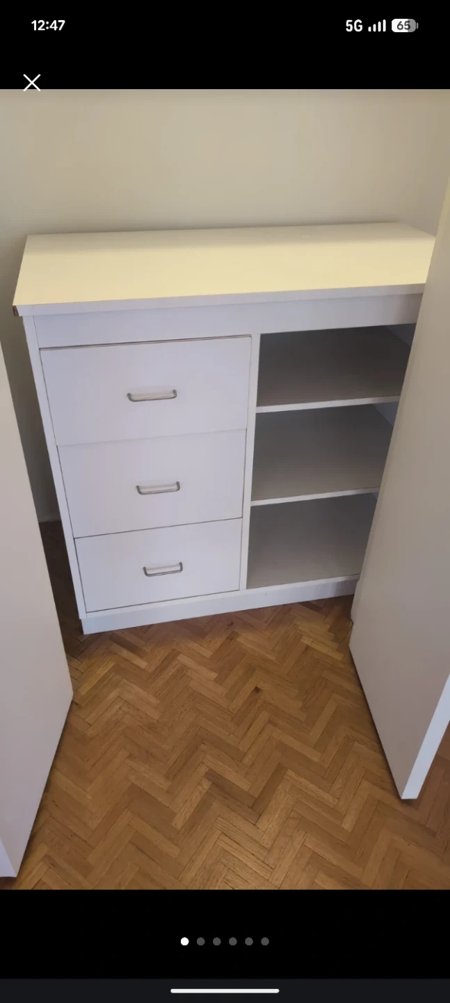 White cabinet with three drawers on the left and open shelving on the right. It's made of particleboard. Useful for storing clothes or other household items.