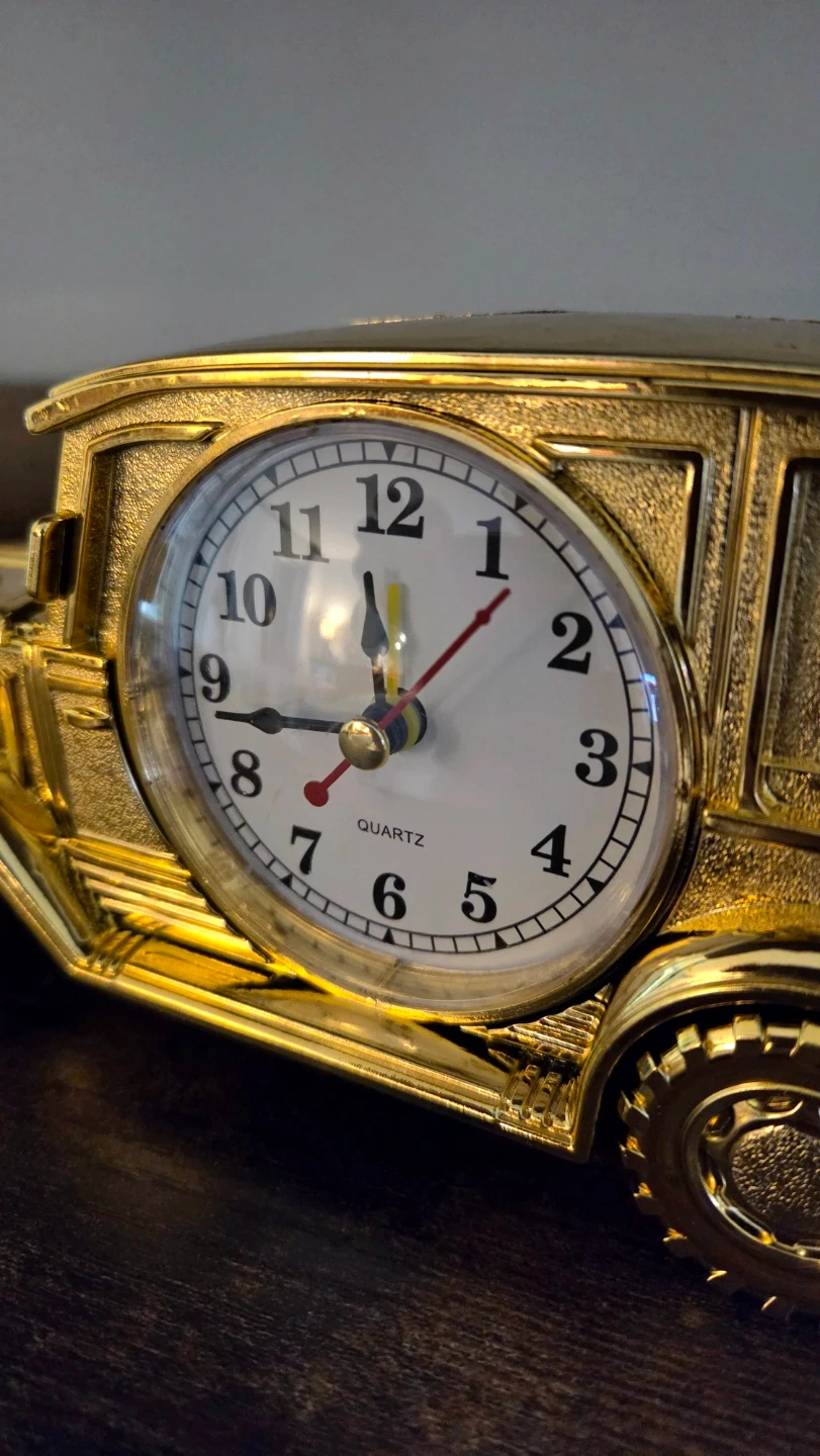 This unique alarm clock is designed to look like a vintage jeep. It is brand new and never been used. It features a construction with intricate detailing. The clock face is easy to read and it's powered by a quartz movement. It's a fun decorative piece for any desk or shelf! It has two knots – one to set the time, the other to set the alarm clock. Please don't ask for a lower price.