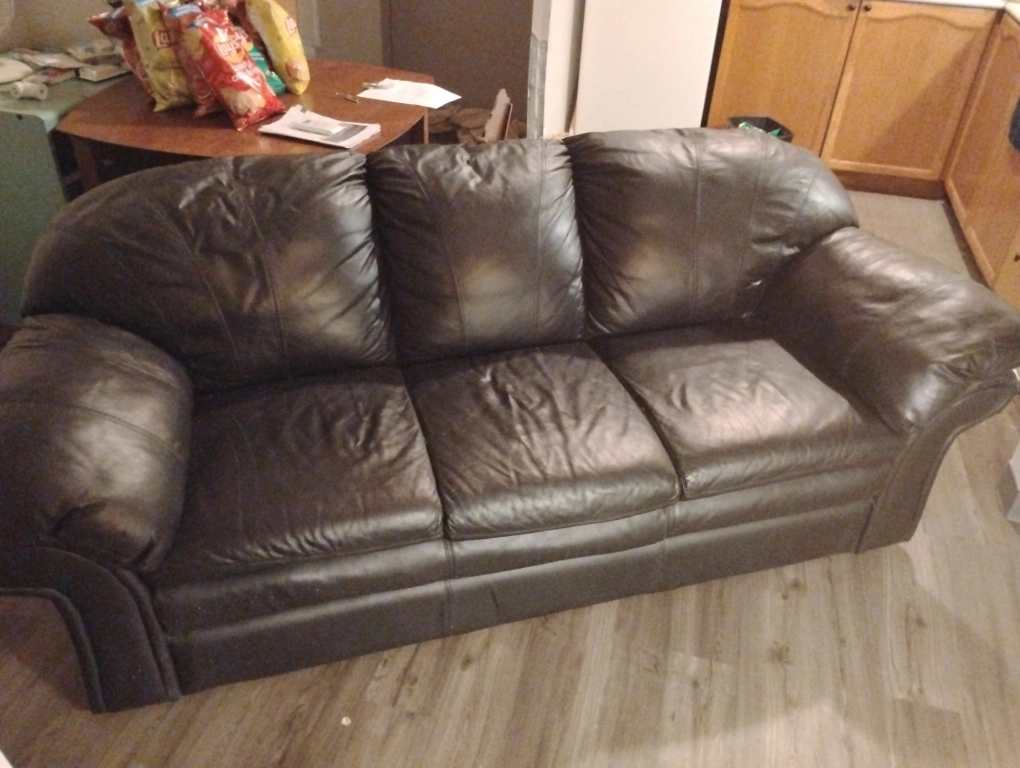 Selling a comfortable brown leather sofa. It's a great addition to any living room and has plenty of space for relaxing. The sofa shows some signs of wear, but it's still in good condition and ready for a new home!