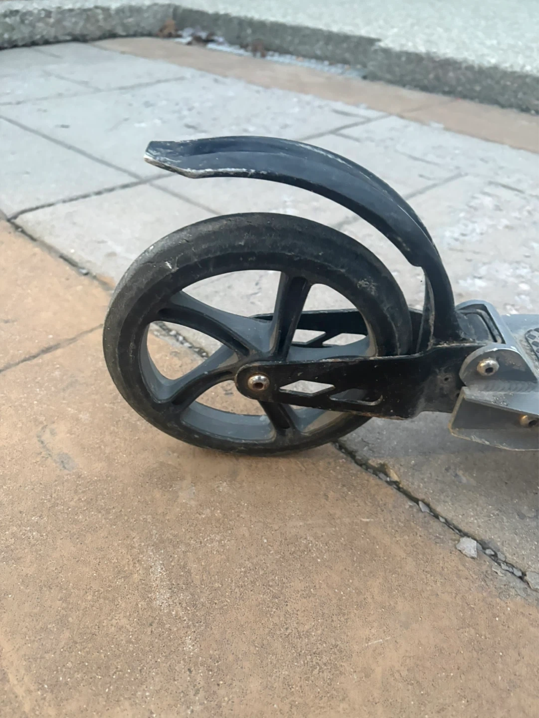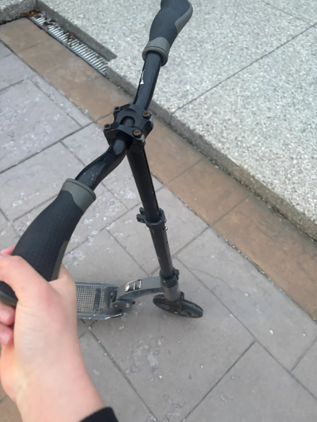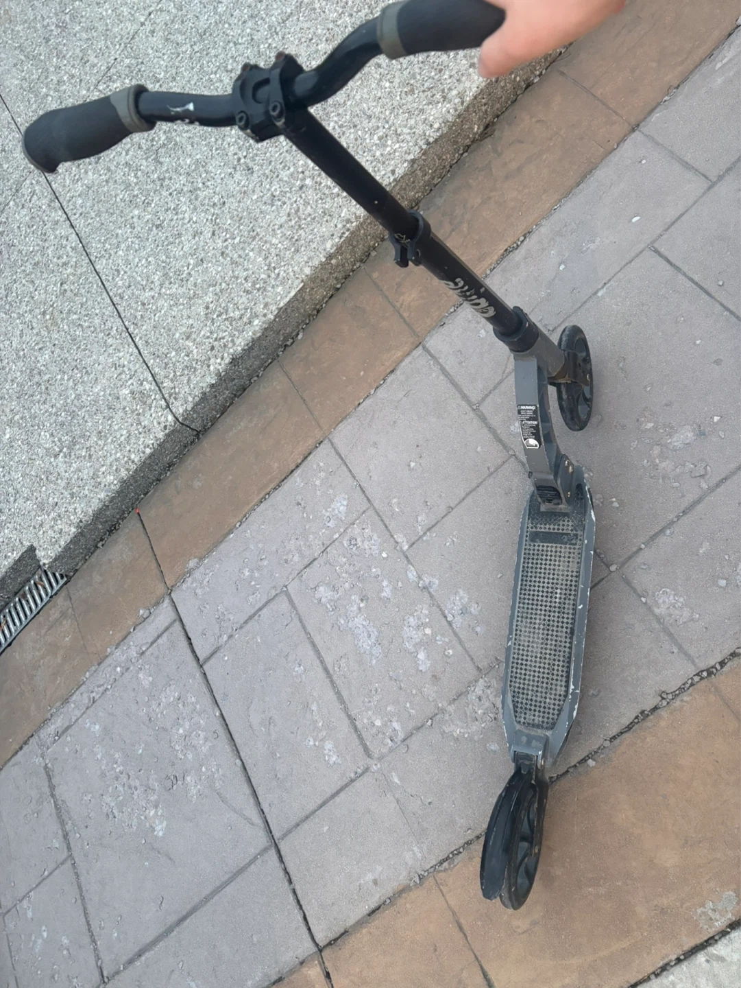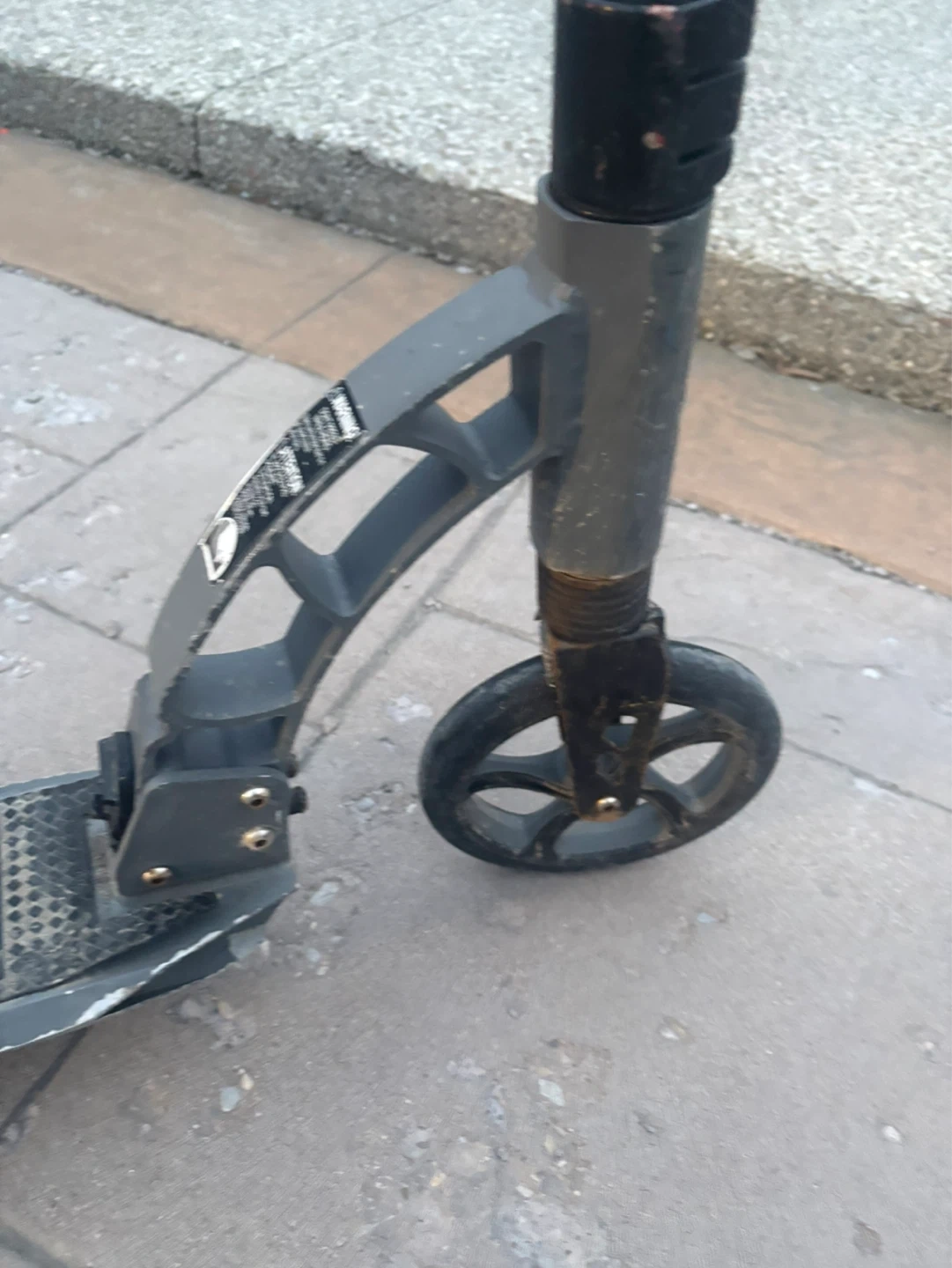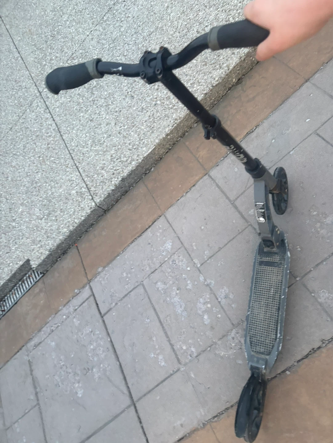 Used black and grey Razor kick scooter. It has adjustable handlebars and a foldable frame. Some wear and tear present, but still in working condition.