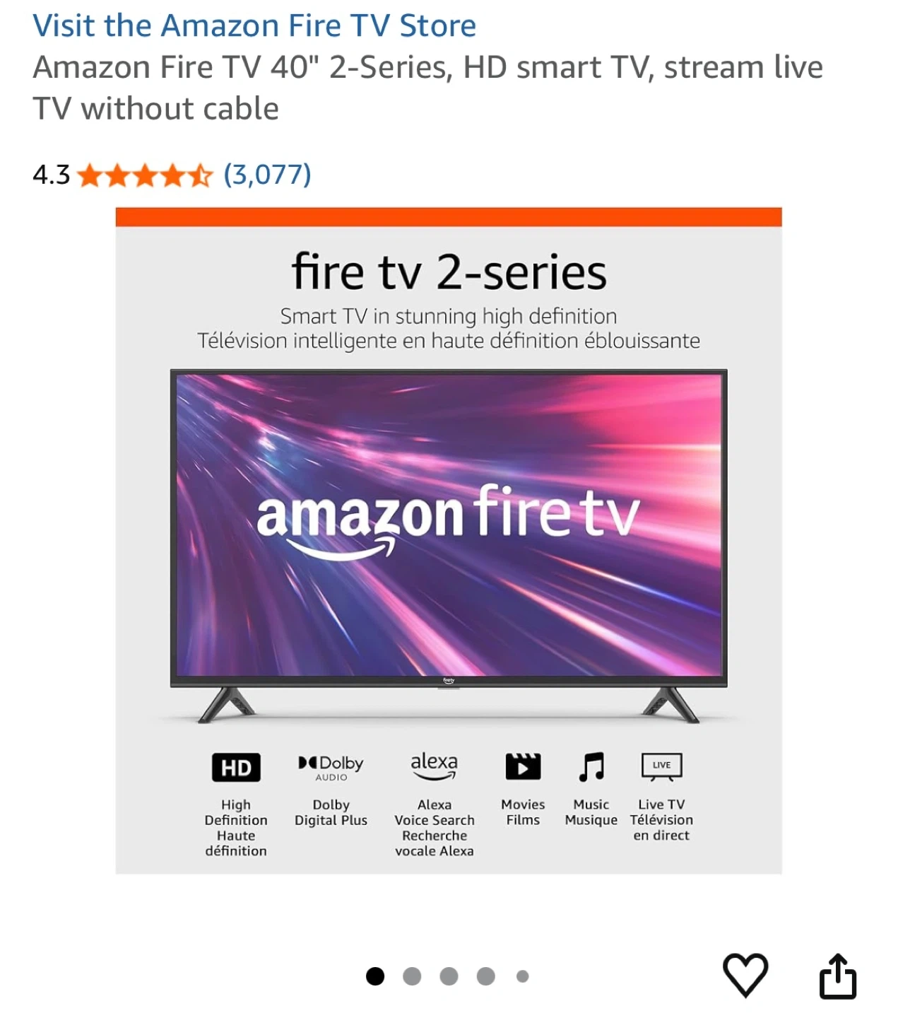 This is a 40-inch HD smart TV from Amazon Fire TV. It offers high definition viewing with Dolby Digital Plus audio. It's a great way to stream your favourite movies and shows!