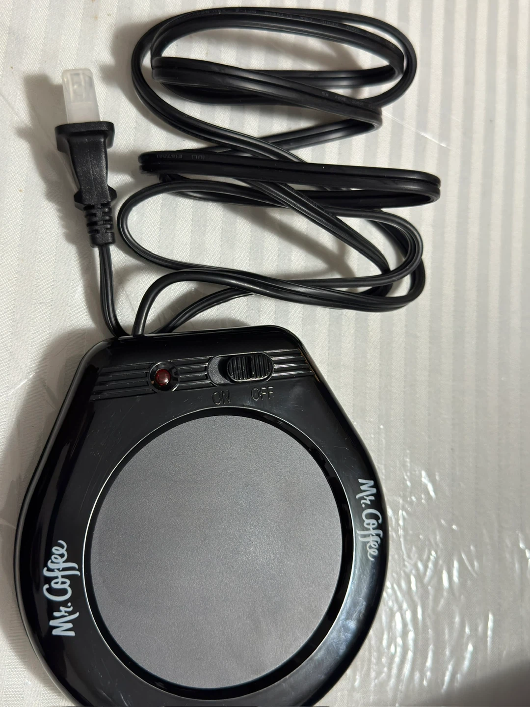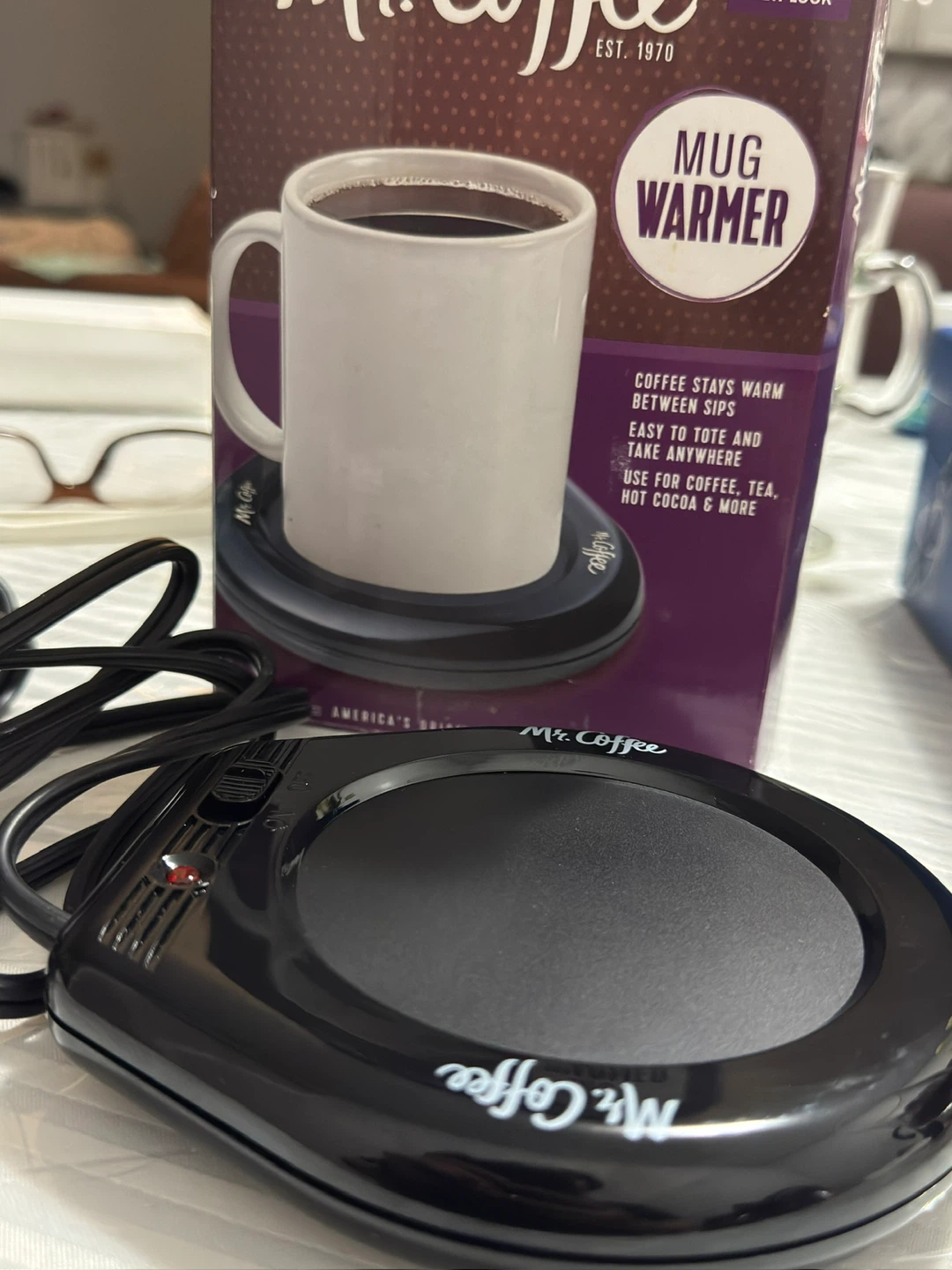 Keep your coffee, tea, or hot cocoa warm between sips! This Mr. Coffee mug warmer is easy to tote and take anywhere. It's black and comes with a power cord.