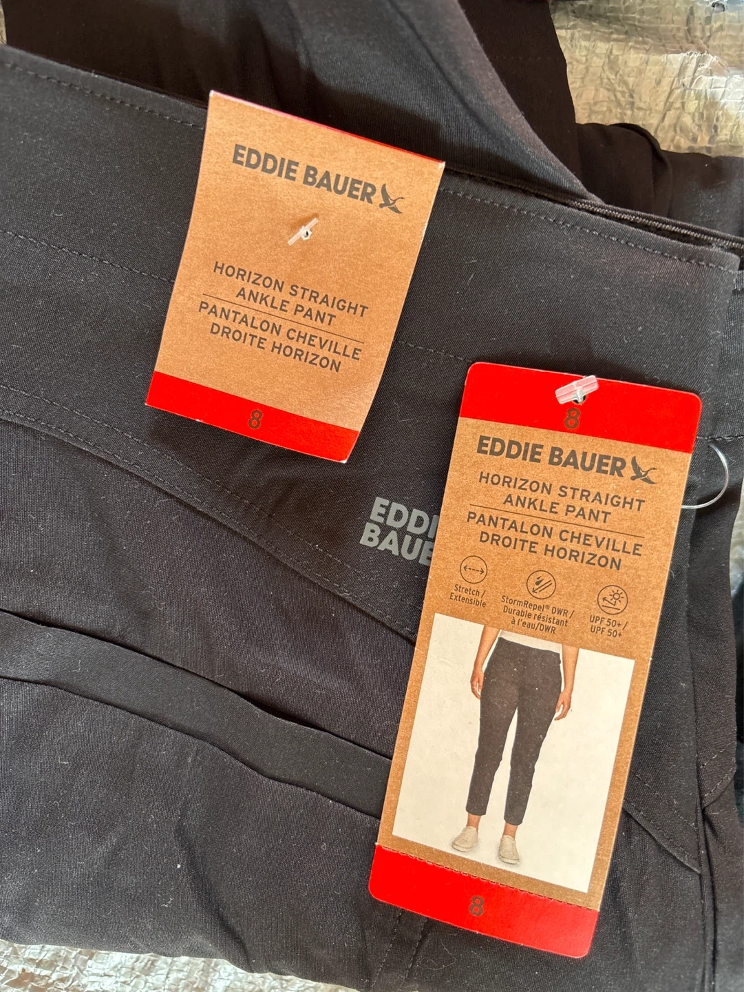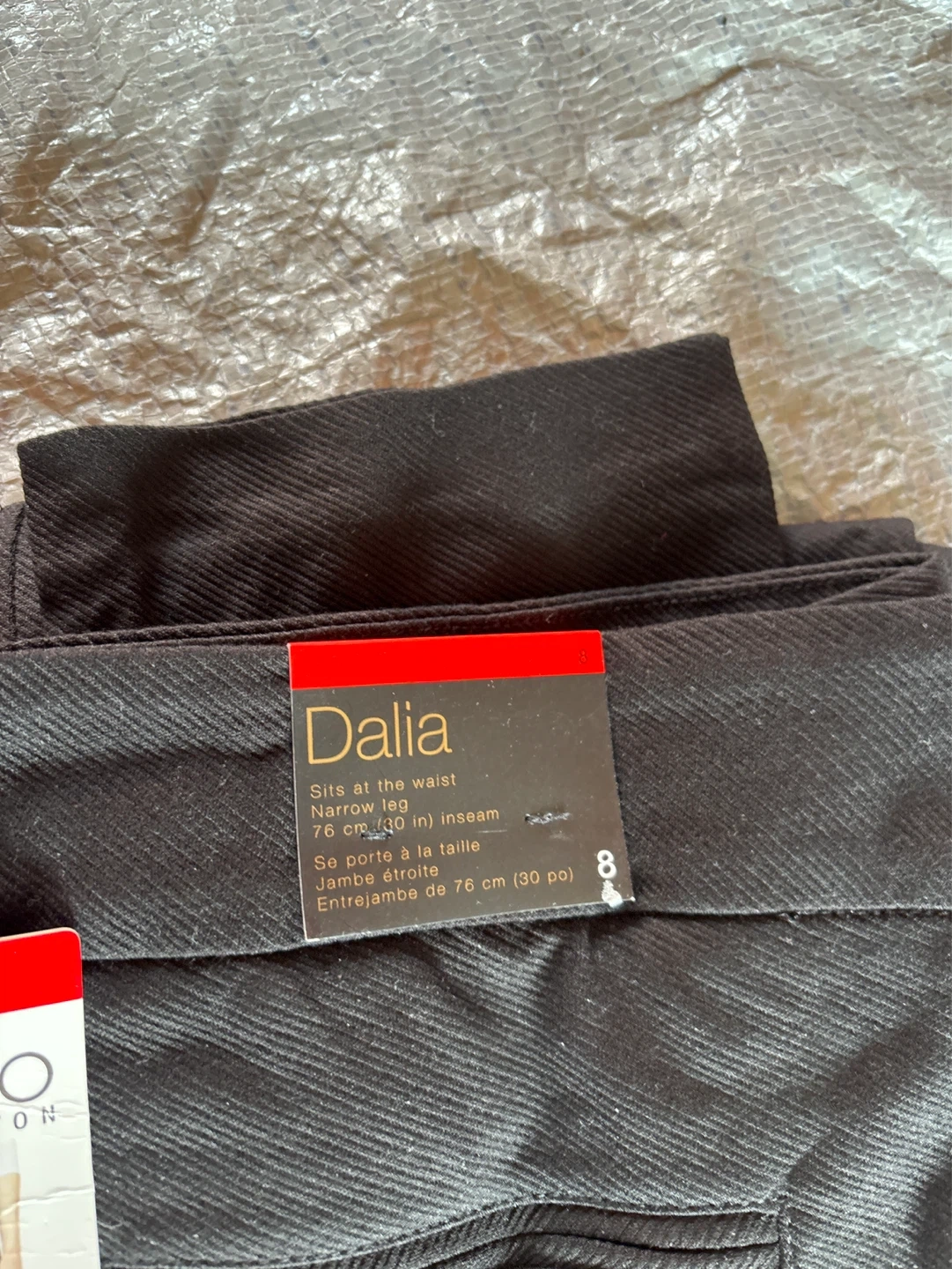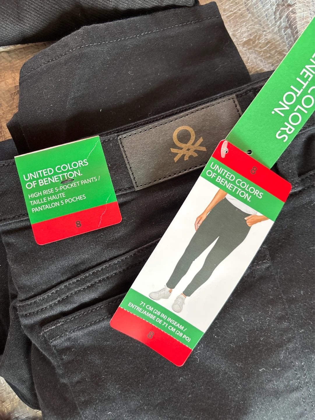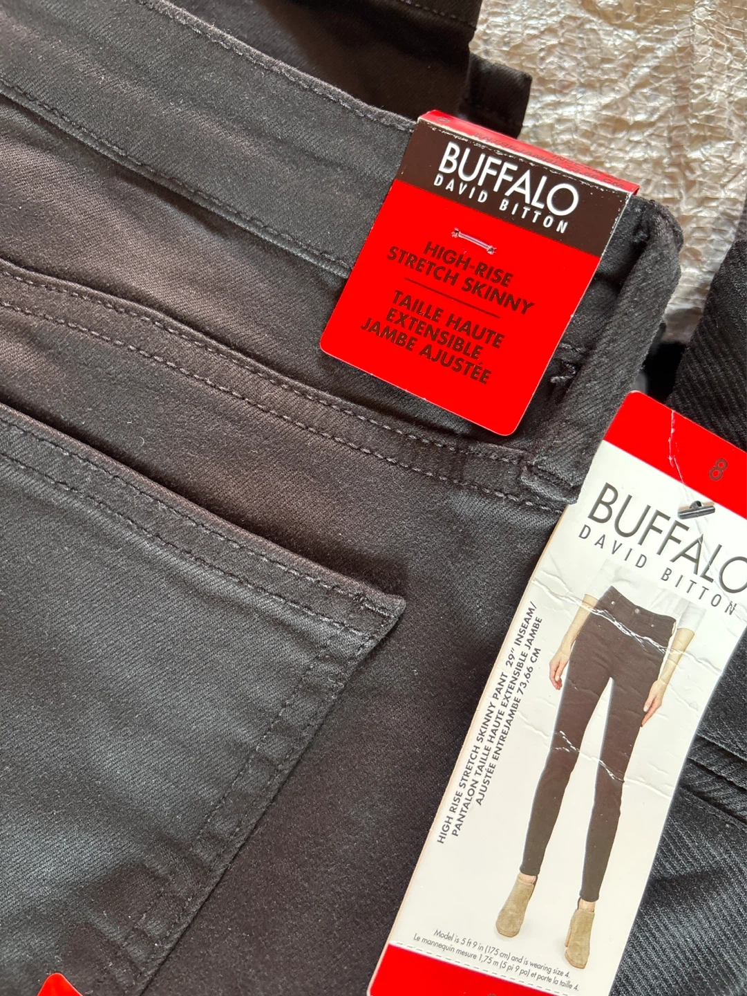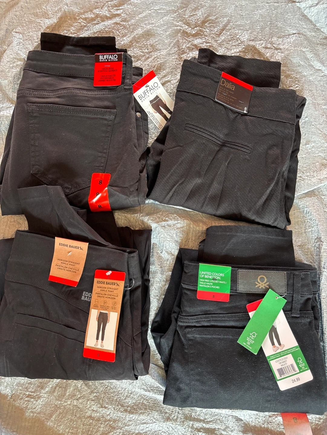 Bundle of black pants. Includes United Colors of Benetton high-rise 5-pocket pants (size 8), Buffalo David Bitton high-rise stretch skinny pants (size 8), Eddie Bauer Horizon Straight Ankle Pants (size 8), and Dalia pants with a 76 cm (30 in) inseam.