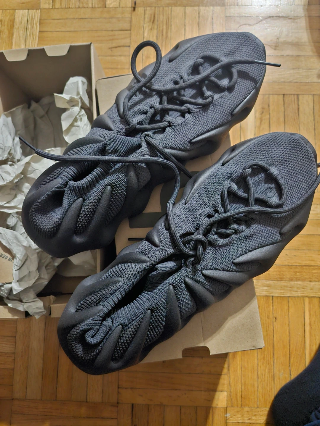 These Adidas Yeezy 450 sneakers come in a dark slate colourway. They're made with a knit upper and a unique sculpted sole. Includes original box.