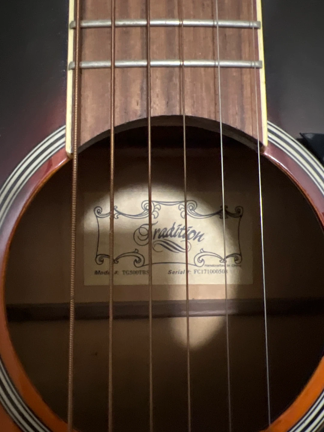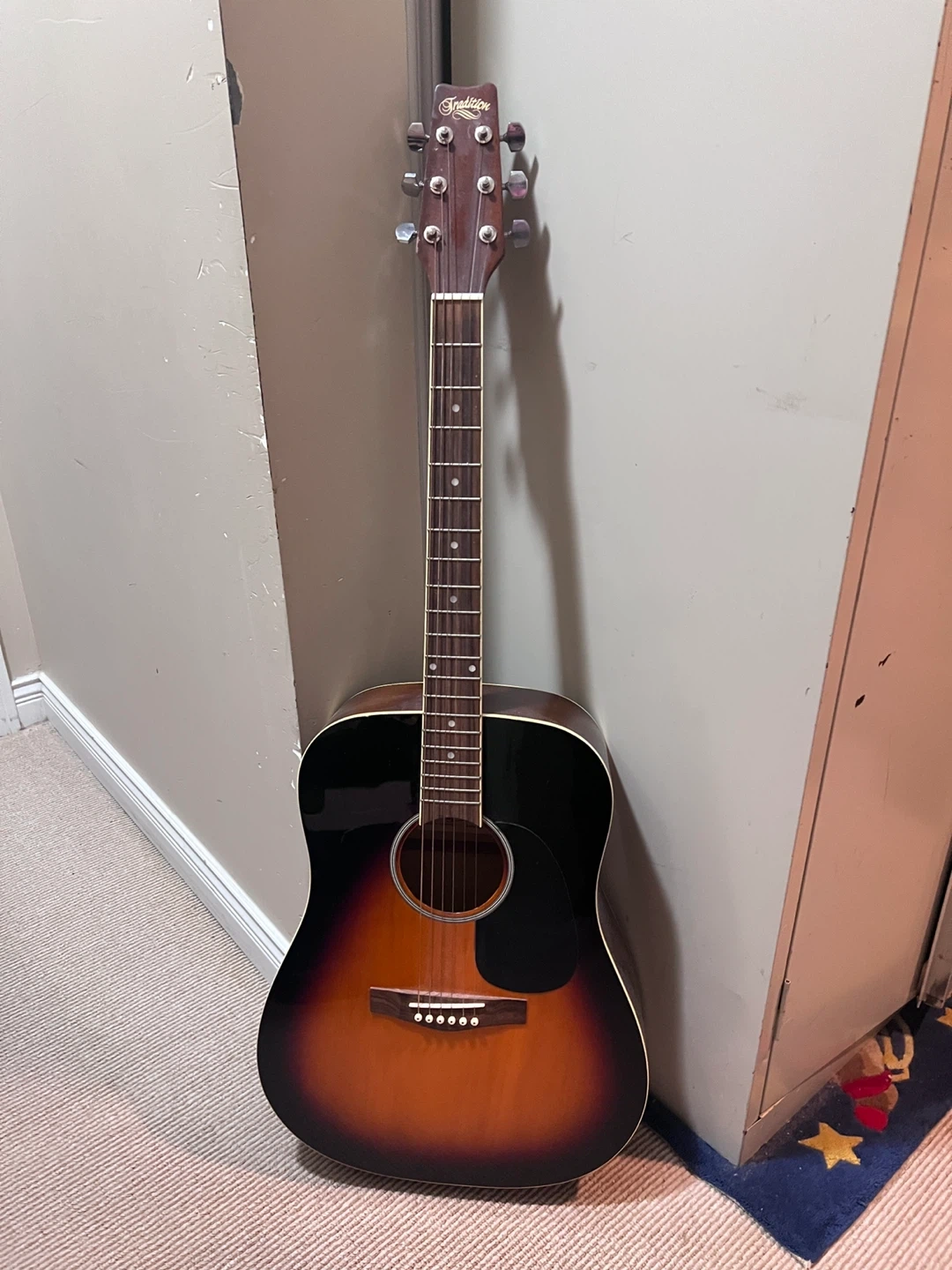 Tradition acoustic guitar. Shows some minor scratches and dust. Great for beginners or casual players!