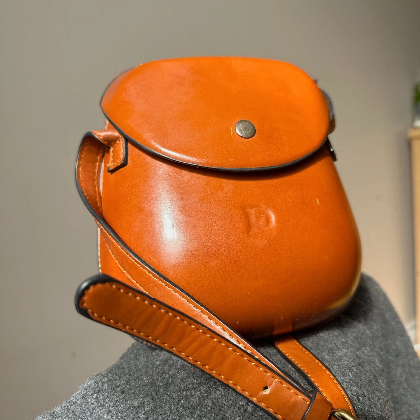 This is an orange leather crossbody bag. It has a turn-lock closure and an adjustable strap. This bag is made of genuine leather.