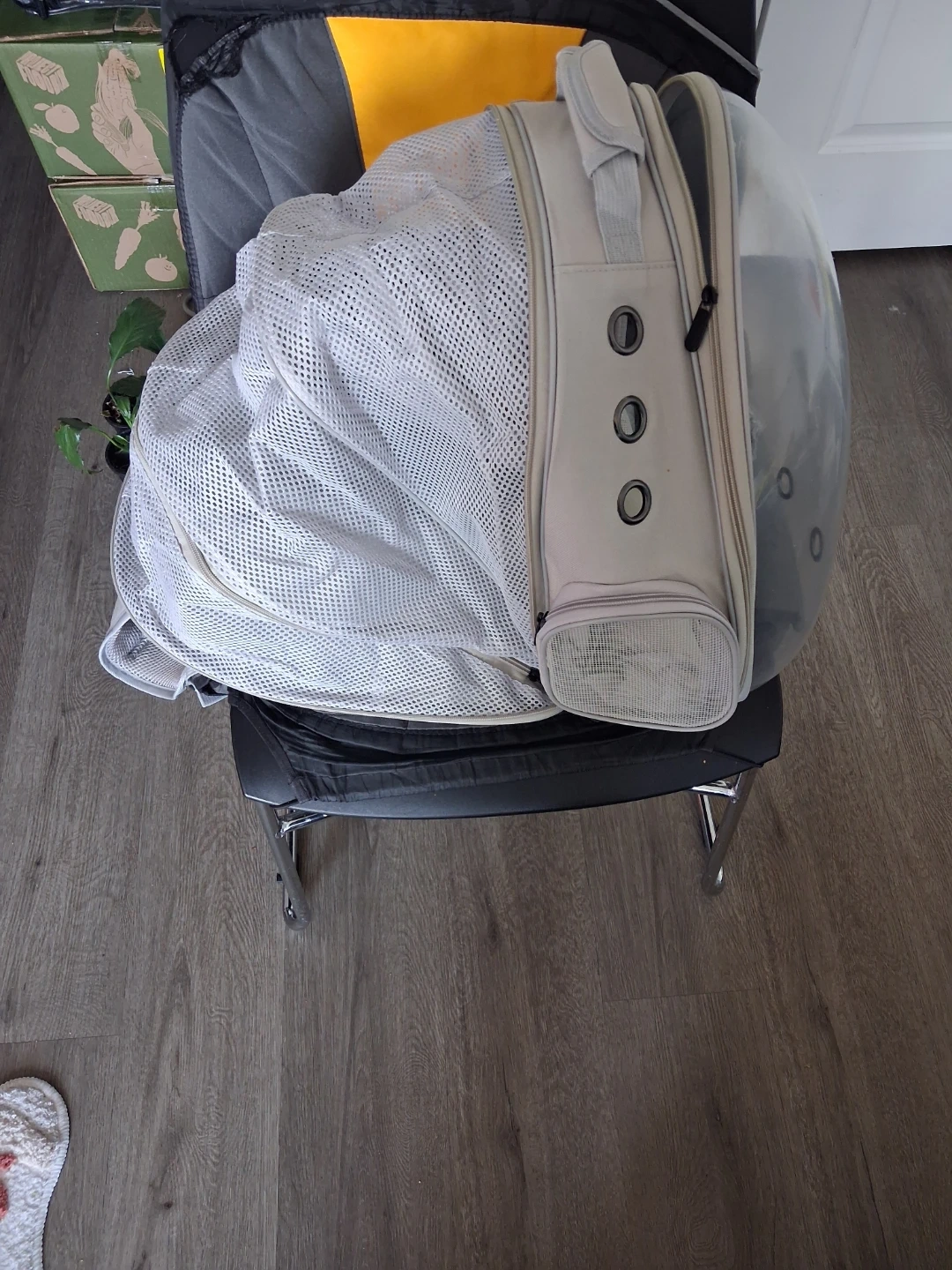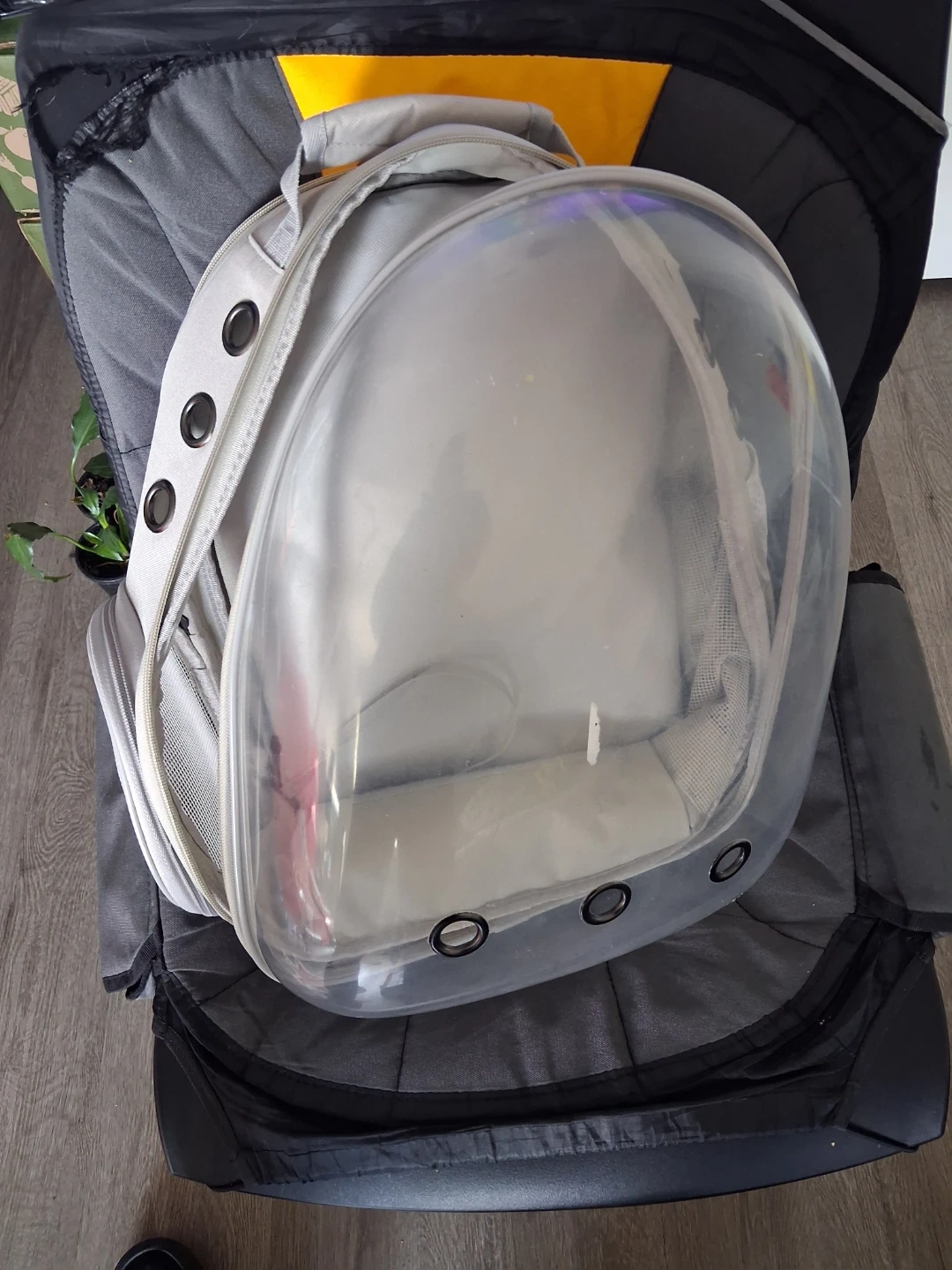 This bubble backpack carrier is designed for pets. It has a clear dome for your pet to see out and ventilation holes for airflow. Includes a mesh cover and a soft interior pad.