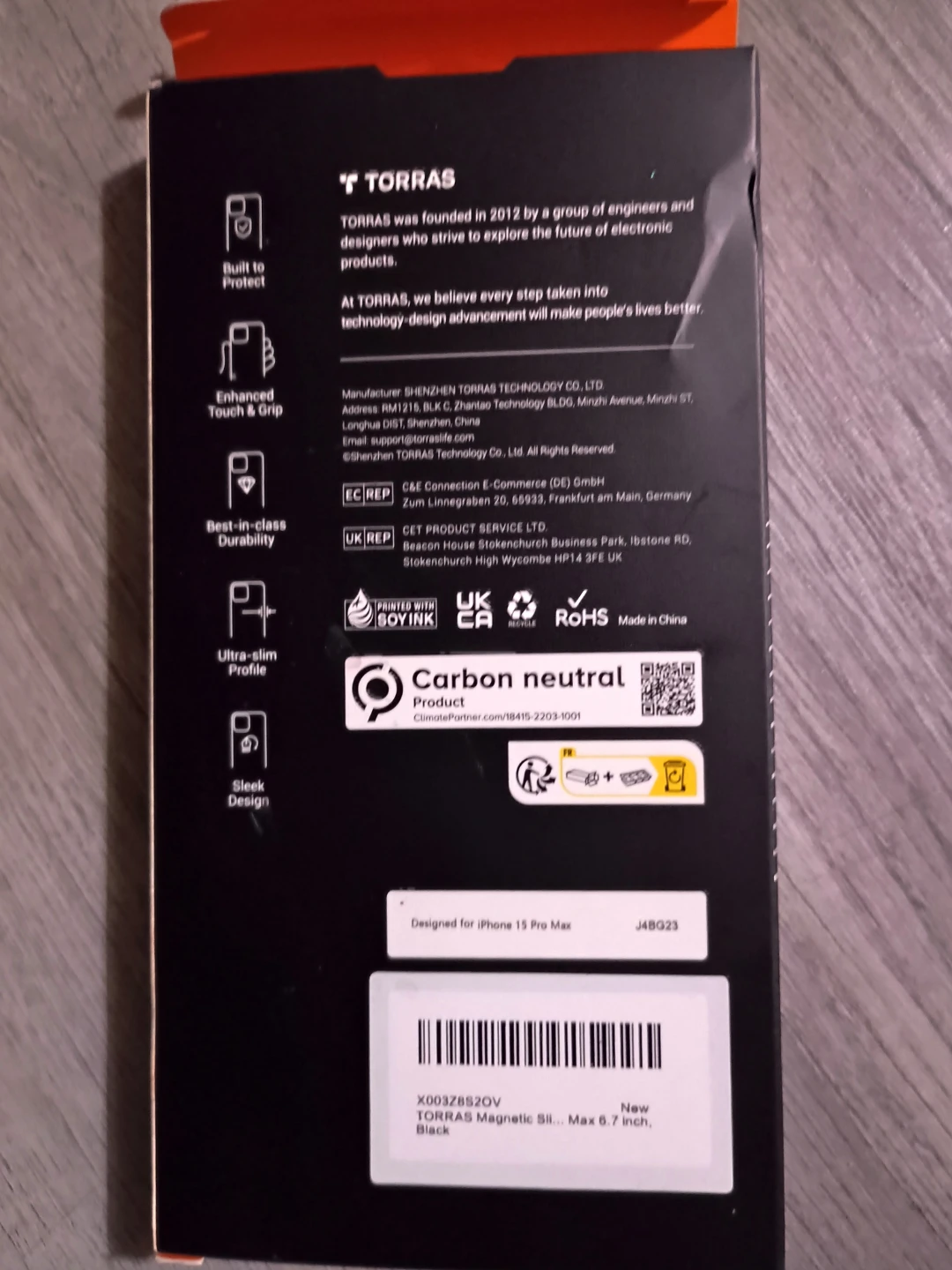 TORRAS magnetic slim case designed for iPhone 15 Pro Max. It's carbon neutral and offers enhanced touch & grip with an ultra-slim profile. Made in China.
