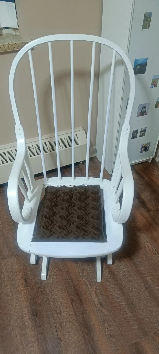This rocking chair is made of white wood and includes a soft brown cushion. It's designed for comfort and relaxation. This chair would be great for a nursery or a cozy reading nook.
