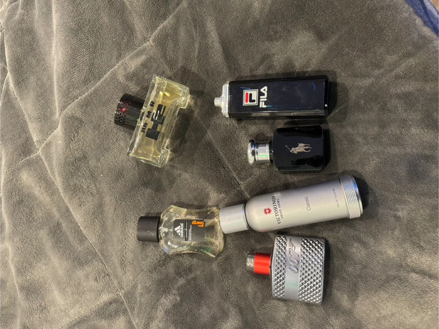A selection of men's fragrances including Polo Black, Victorinox Swiss Army Classic, Fila, Adidas Energy, and James Bond 007.