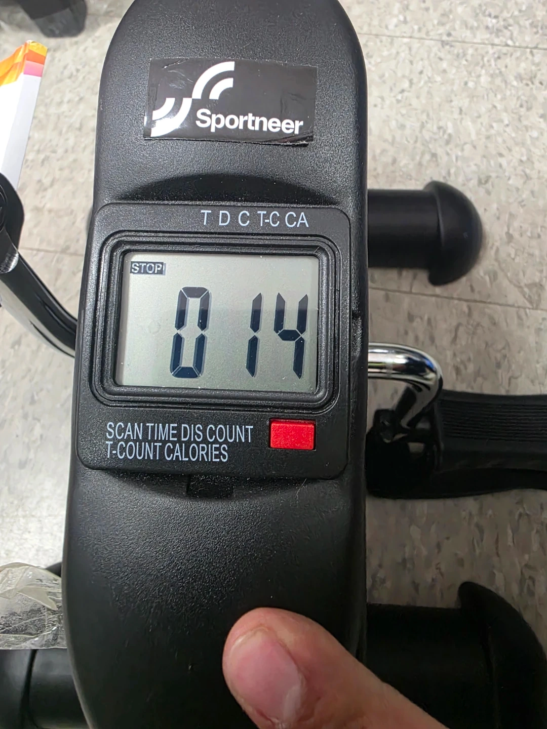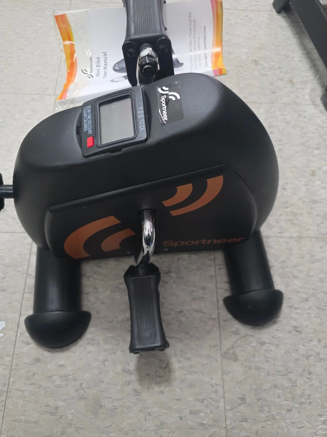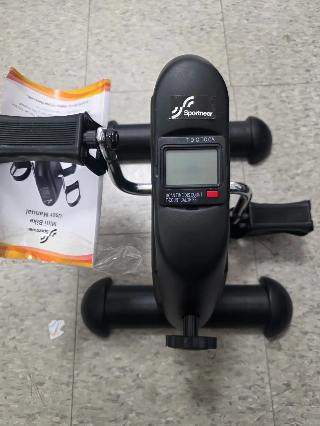 This Sportneer mini exercise bike is designed for home use. It features a digital display showing scan, time, distance, count, and calories burned. Compact and easy to use for a quick workout!