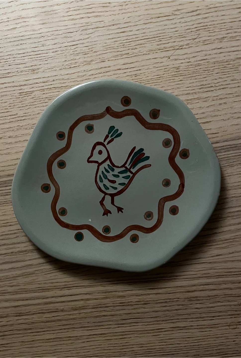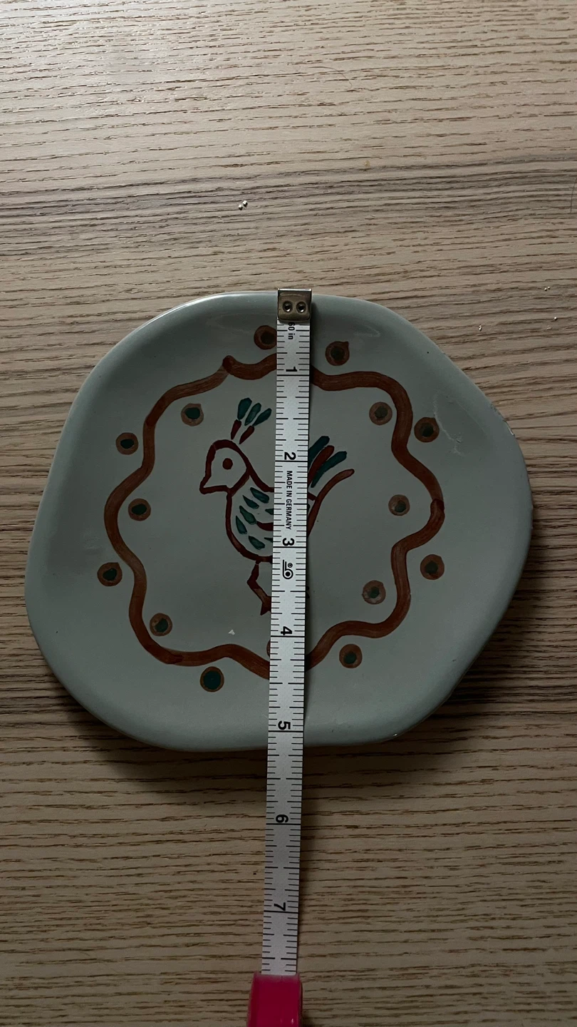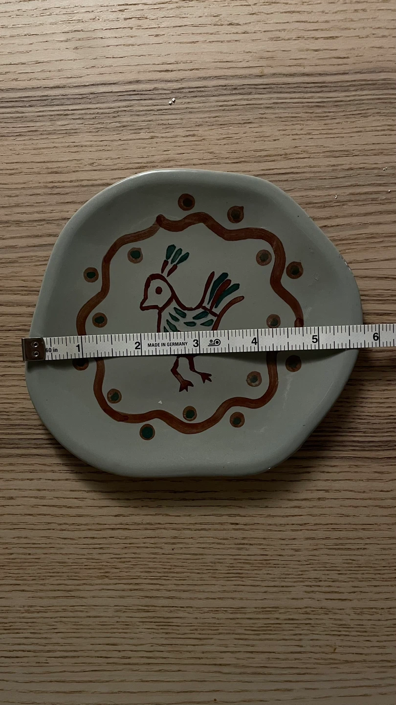 Hand-painted style plate featuring a bird design. Made in India. Beautiful, organic, decorative stoneware piece. Approximately 6 x 5 inches in diameter. Has minor signs of use. Pick up in East Village. Cash only please.