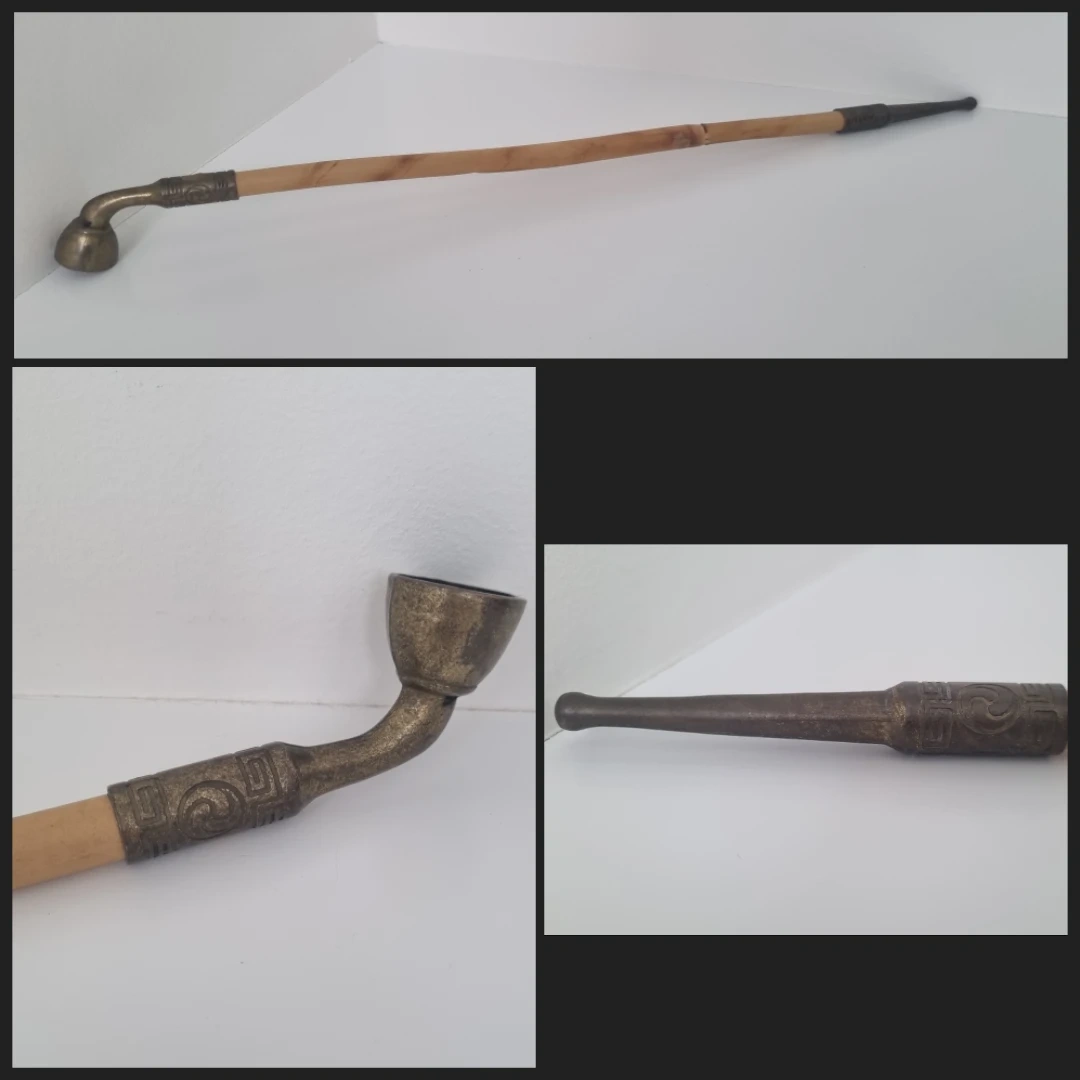 a vintage smoking pipe. It has a unique design with metal accents and a wooden stem. It is in used condition but still has a lot of character