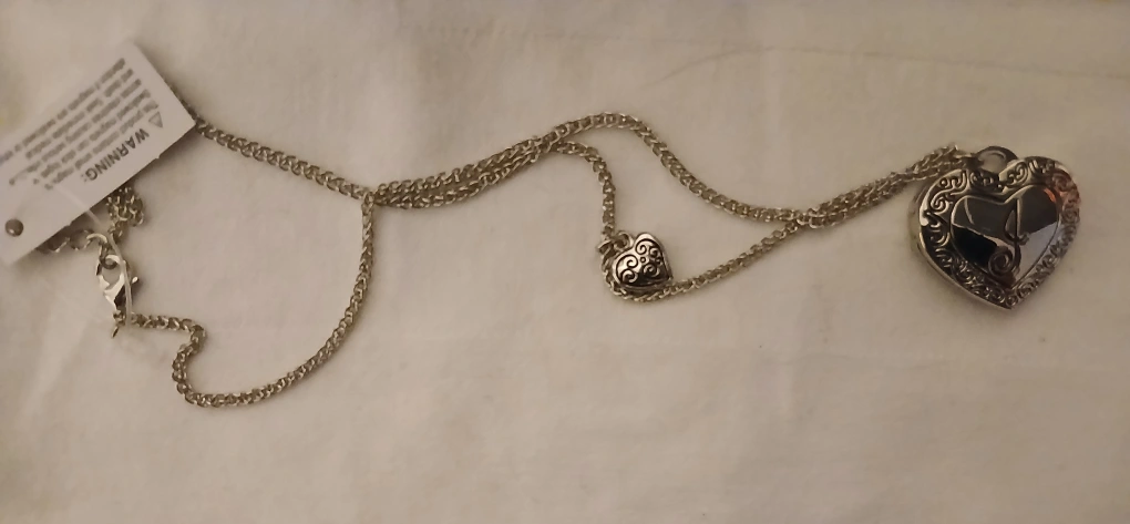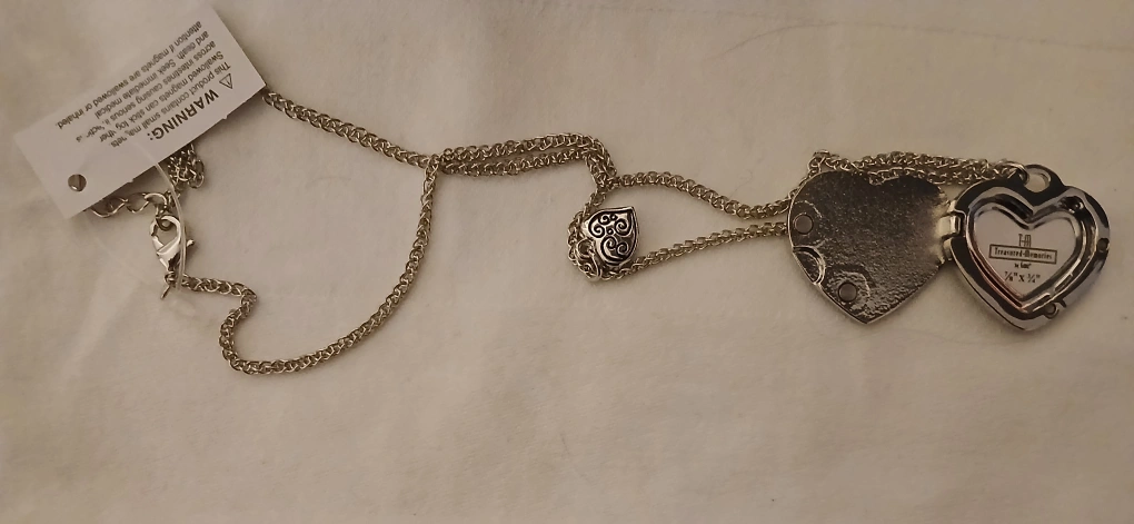 A silver-toned heart locket necklace. It has a delicate chain with a small decorative charm. The locket opens to reveal space for photos. It's a lovely accessory!