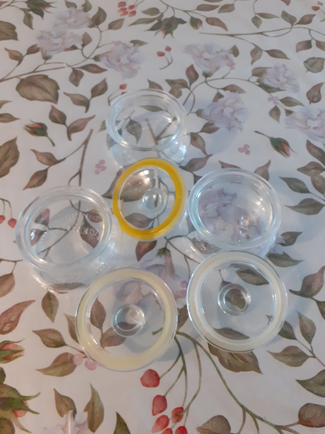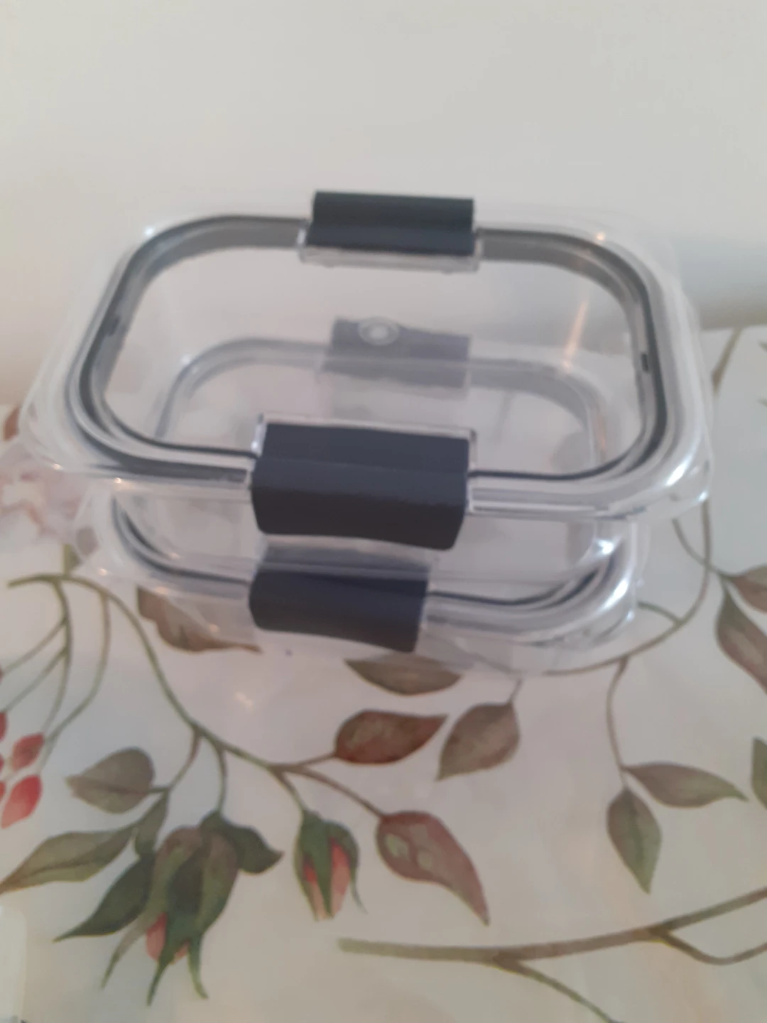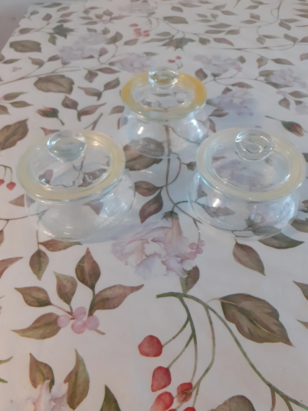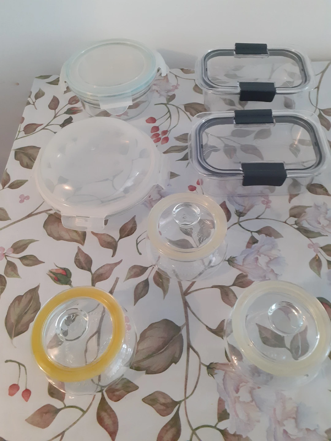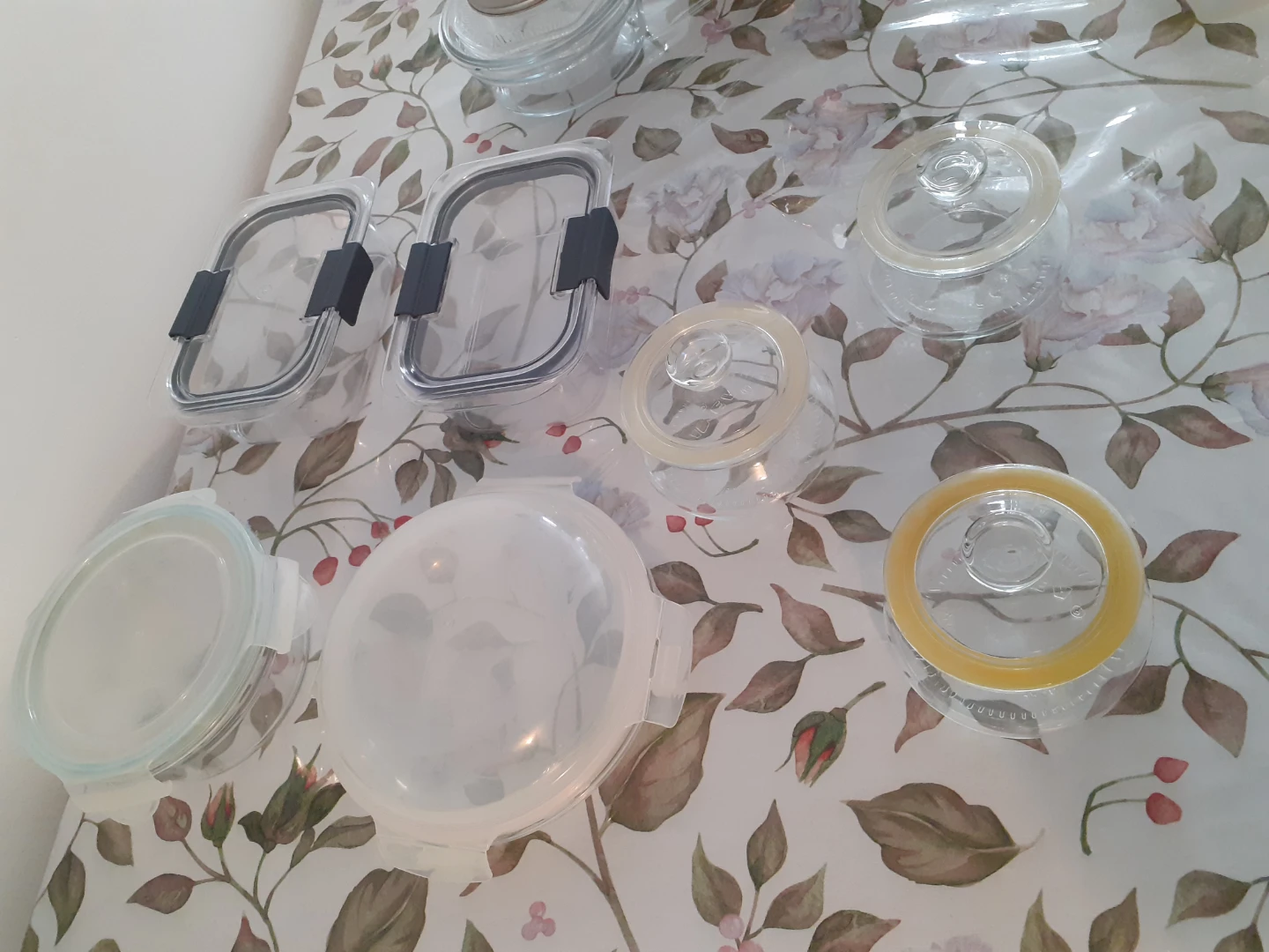 Set of glass food storage containers with plastic lids. Includes various round and rectangular sizes. Great for meal prep and leftovers!