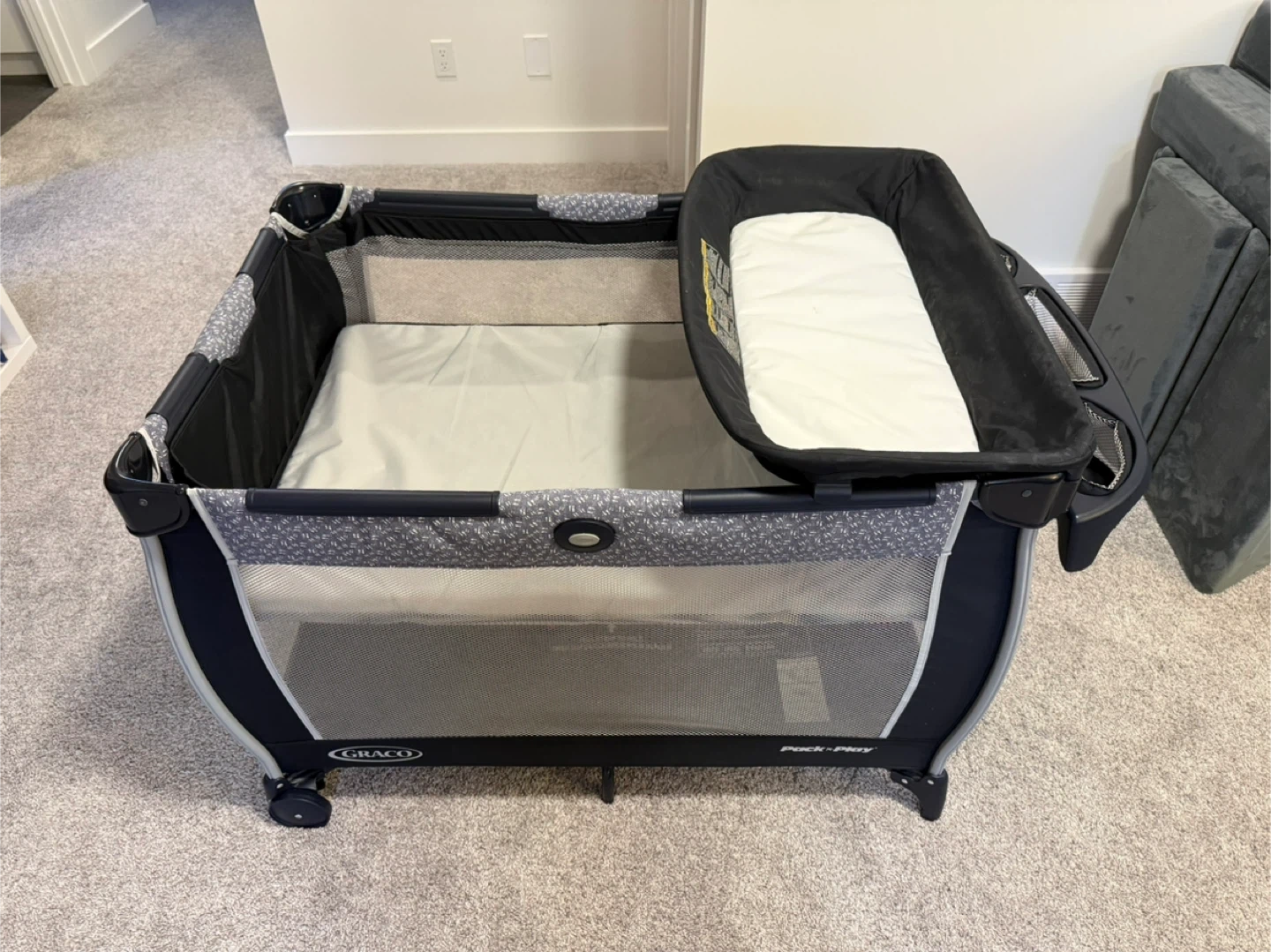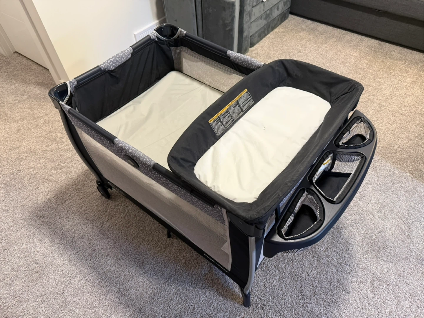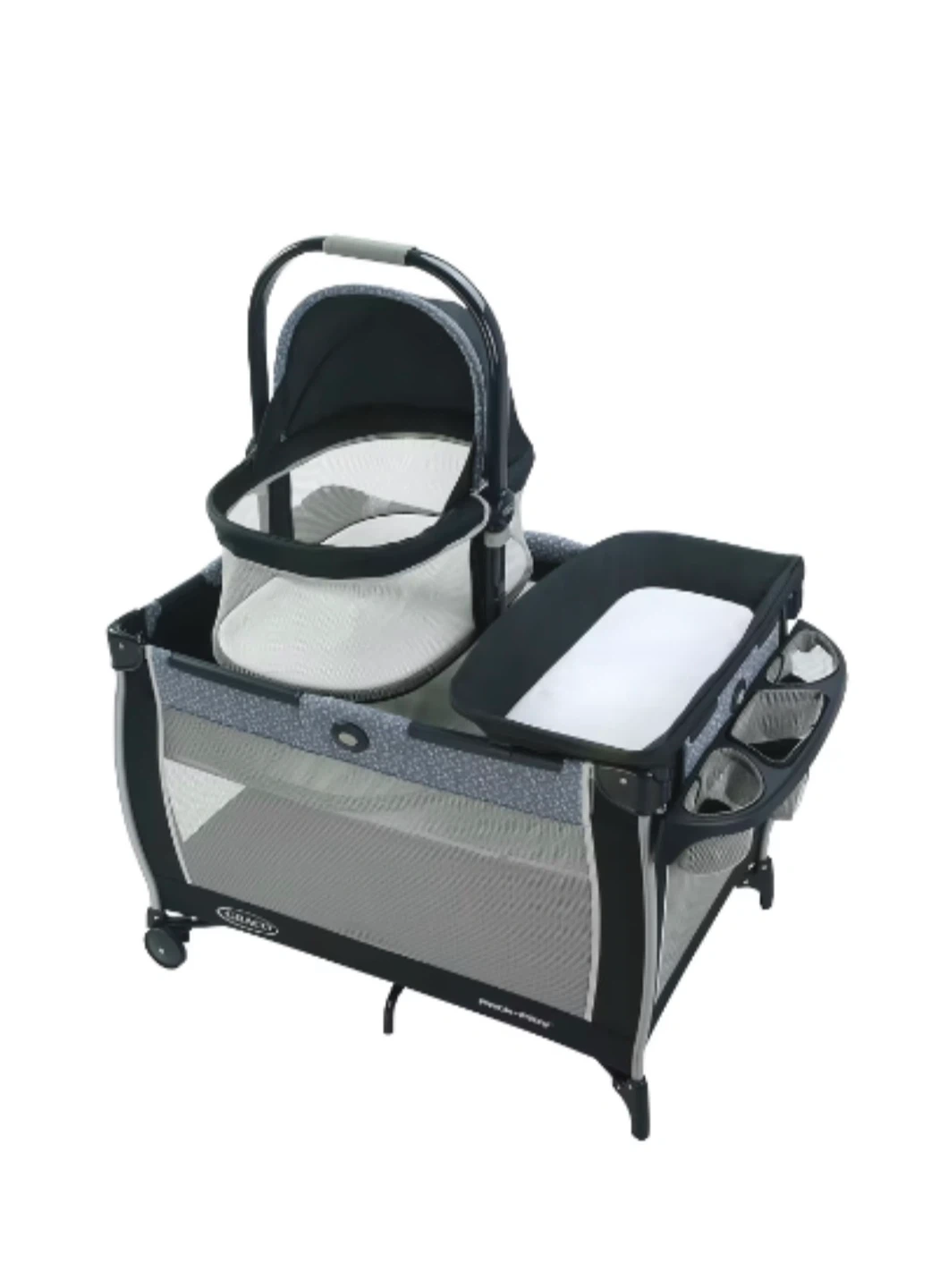 Graco Pack 'n Play portable playard with bedside bassinet. Features a convenient diaper changing station on the side with storage pockets.