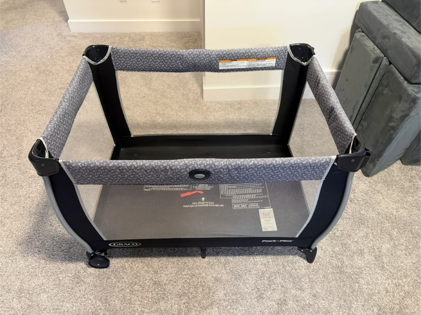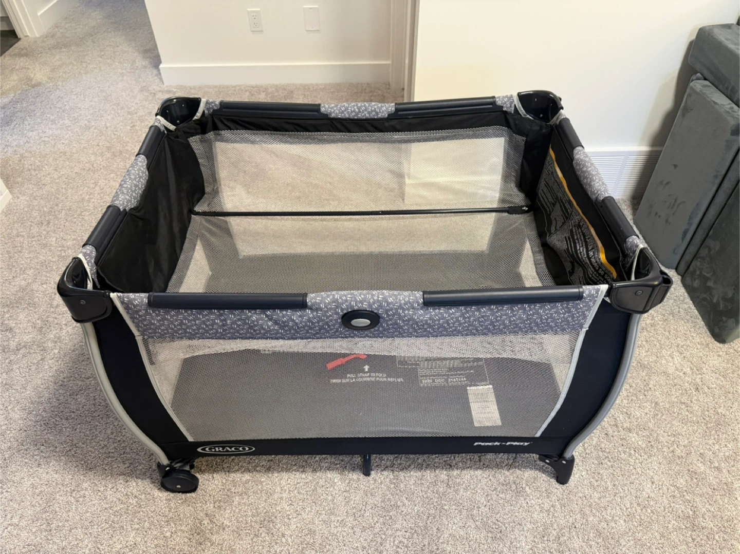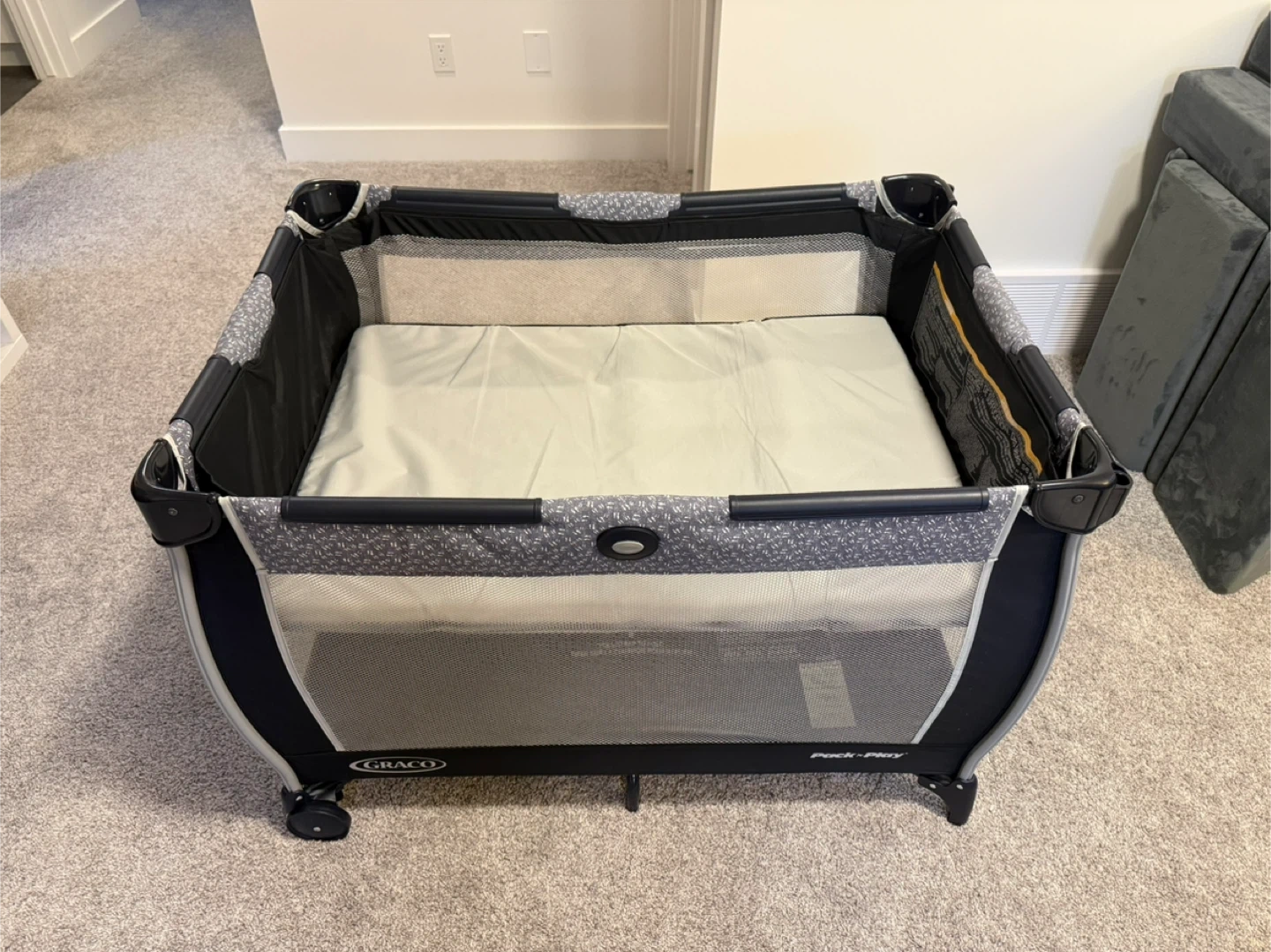 Graco Pack 'n Play portable playard with bedside bassinet. Features a convenient diaper changing station on the side with storage pockets.