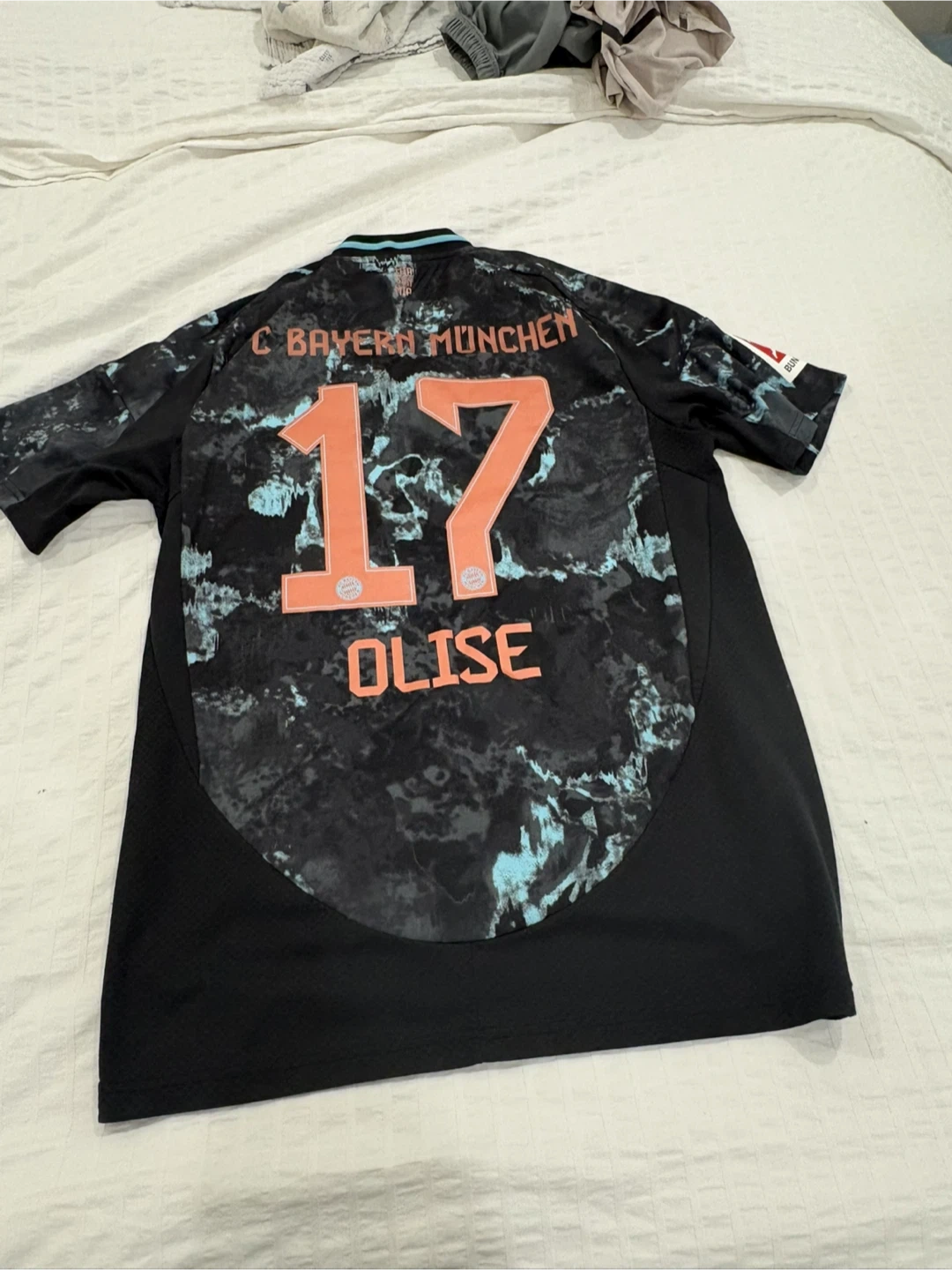 This is an Adidas Bayern Munich soccer jersey from the 2023/24 season. It's a size medium with a slim fit. The jersey features the team crest and player number 17, with 'Olise' on the back. AEROREADY technology helps keep you dry. I got straight from the Bayern stadium from Germany it’s 100% real.Prices negotiable.