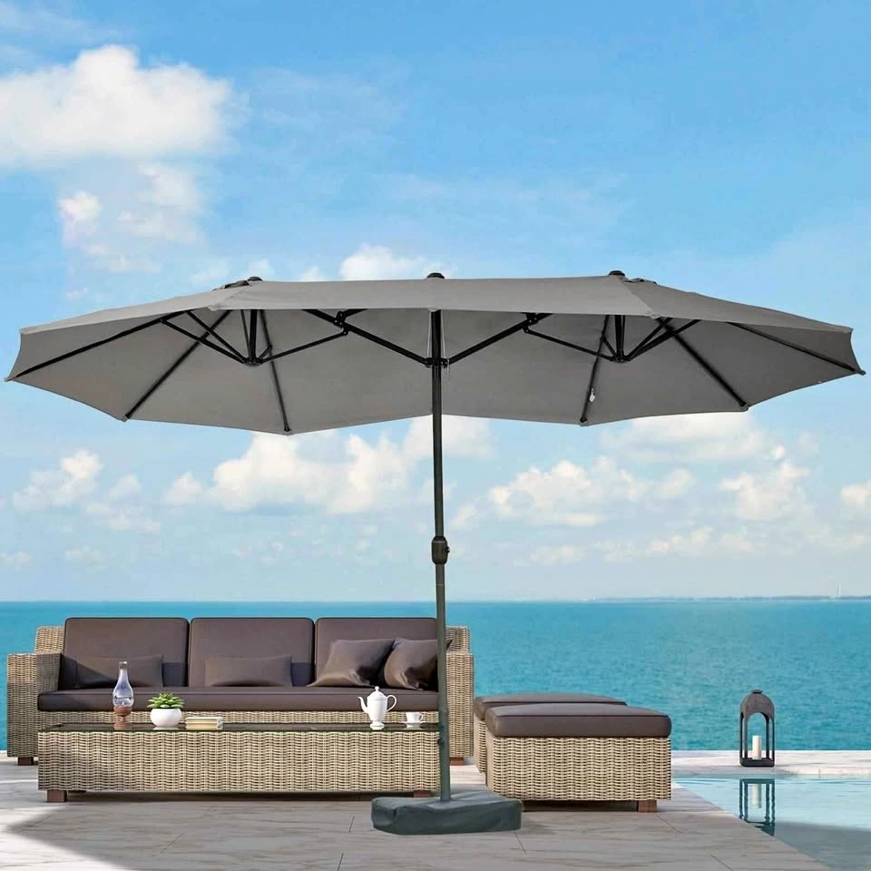 This 15-foot long outdoor umbrella provides added protection with its extra-large double-sided design featuring an 8.7-foot diameter. It can add complete shade to any park, garden, patio, backyard, beach, pool, and outdoor setting. Cross base and sandbag included.