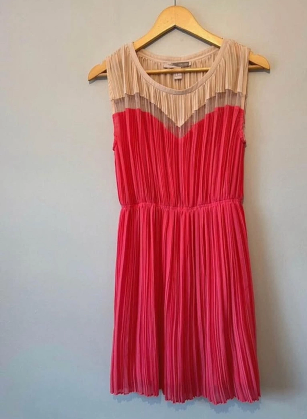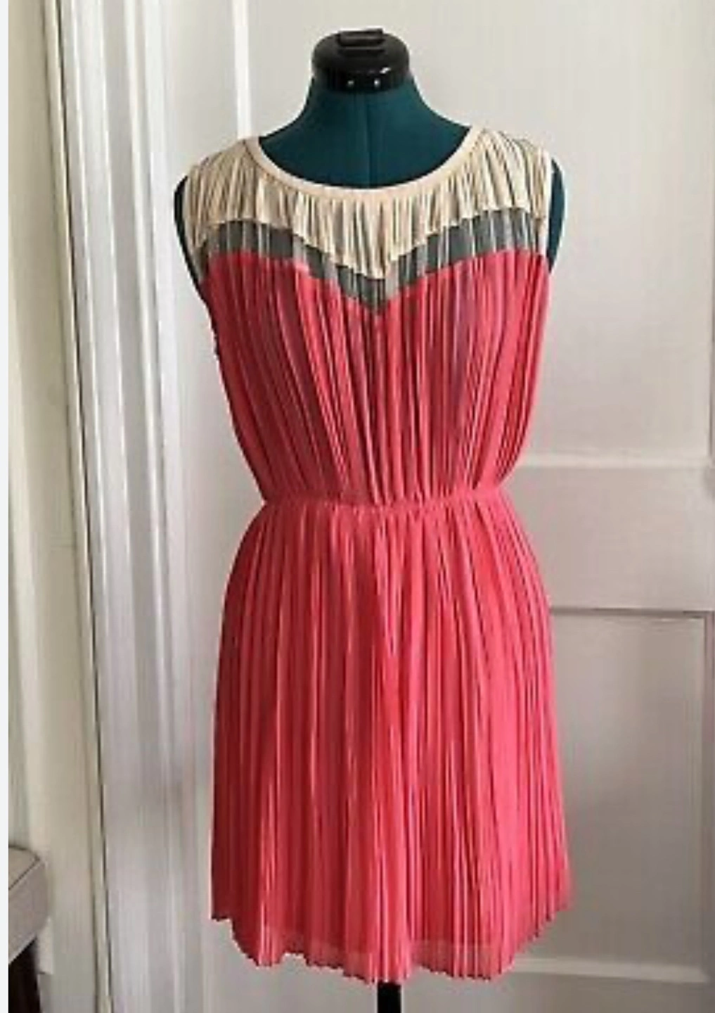 Stunning pink pleated mini dress. Features a beige lace overlay at the neckline. Sleeveless, great for summer. Perfect for a party or special occasion.
