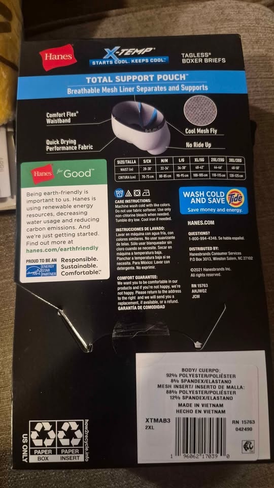 New Hanes X-Temp Total Support Pouch boxer briefs. This is a 3-pack. Size 2XL fits waists 44-46 inches. Features tagless design, lightweight stretch, breathable mesh panels, wicking & odor control. X-Temp technology keeps you cool. Also has Comfort Flex waistband and quick drying fabric. Body is 92% polyester, 8% spandex.