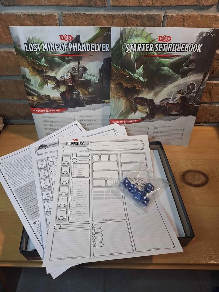 Everything you need to gather your party and start playing! Includes rule book, Lost Mine of Phandelver quest, character sheets, and dice.
