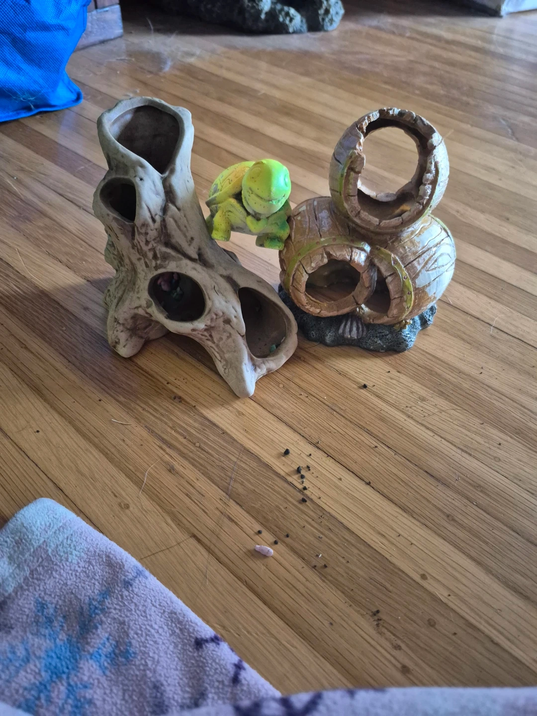 A collection of assorted aquarium decorations including a treasure chest, coral, rocks, and a tree stump with a frog. These pieces add visual interest to fish tanks. They're made from durable materials.