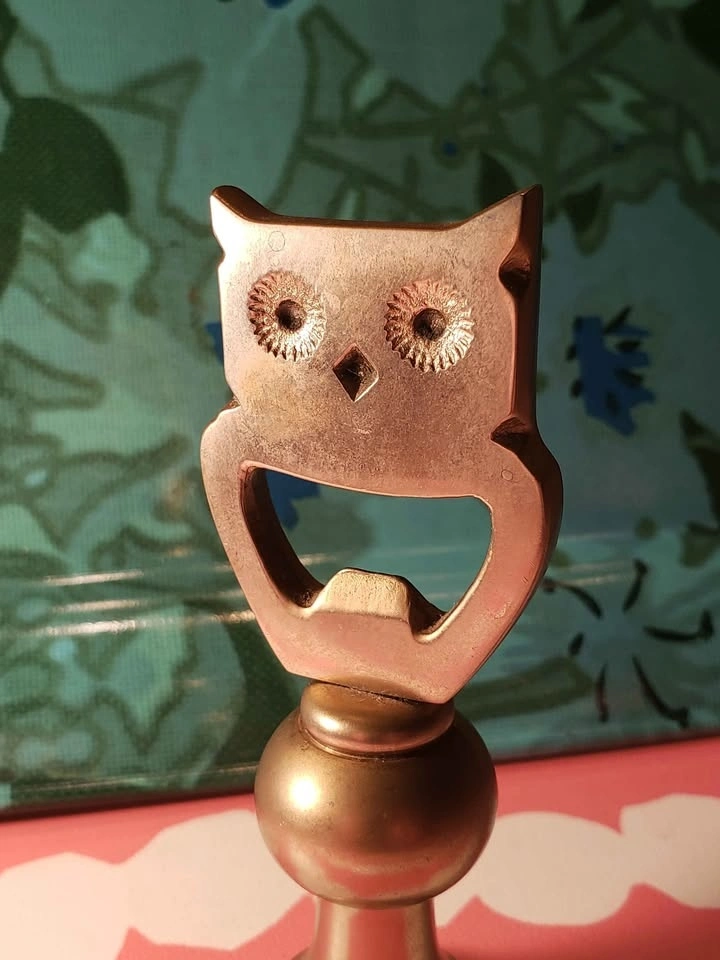 Solid brass owl bottle opener. Weighs about 275 grams. Bell shaped bottom with nice detail around the eyes. A pretty and unique vintage piece. Could make a cute gift or collectible for display. Pick up in Upper Lonsdale North Vancouver.