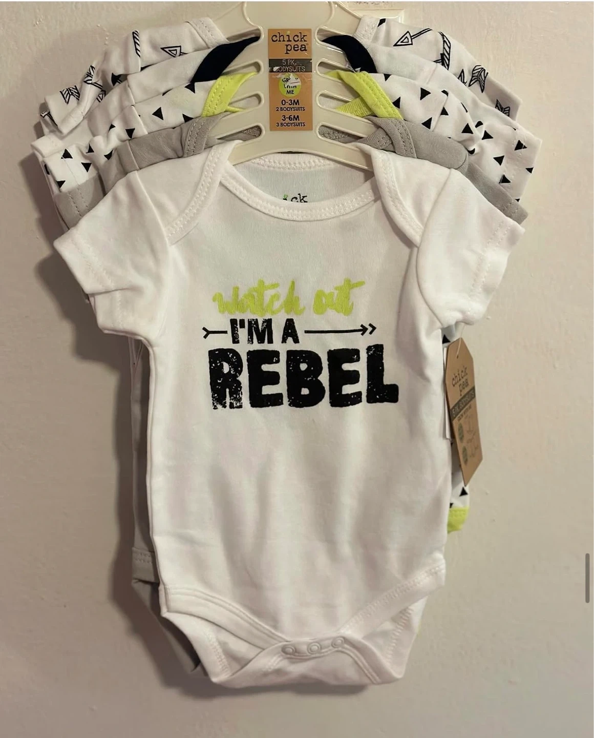 These Chick Pea brand bodysuits are designed for babies aged 0-3 months & 3-6 months, They feature short sleeves and come in a pack of five, showcasing various stylish designs including arrows and the fun slogan 'Watch Out I'm A Rebel'. These are new with tags and ready for your little one!