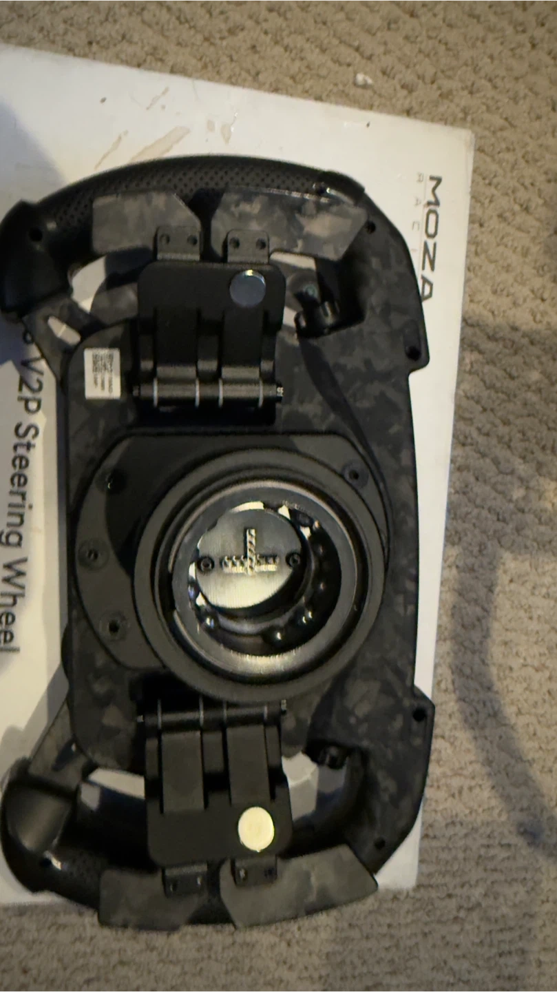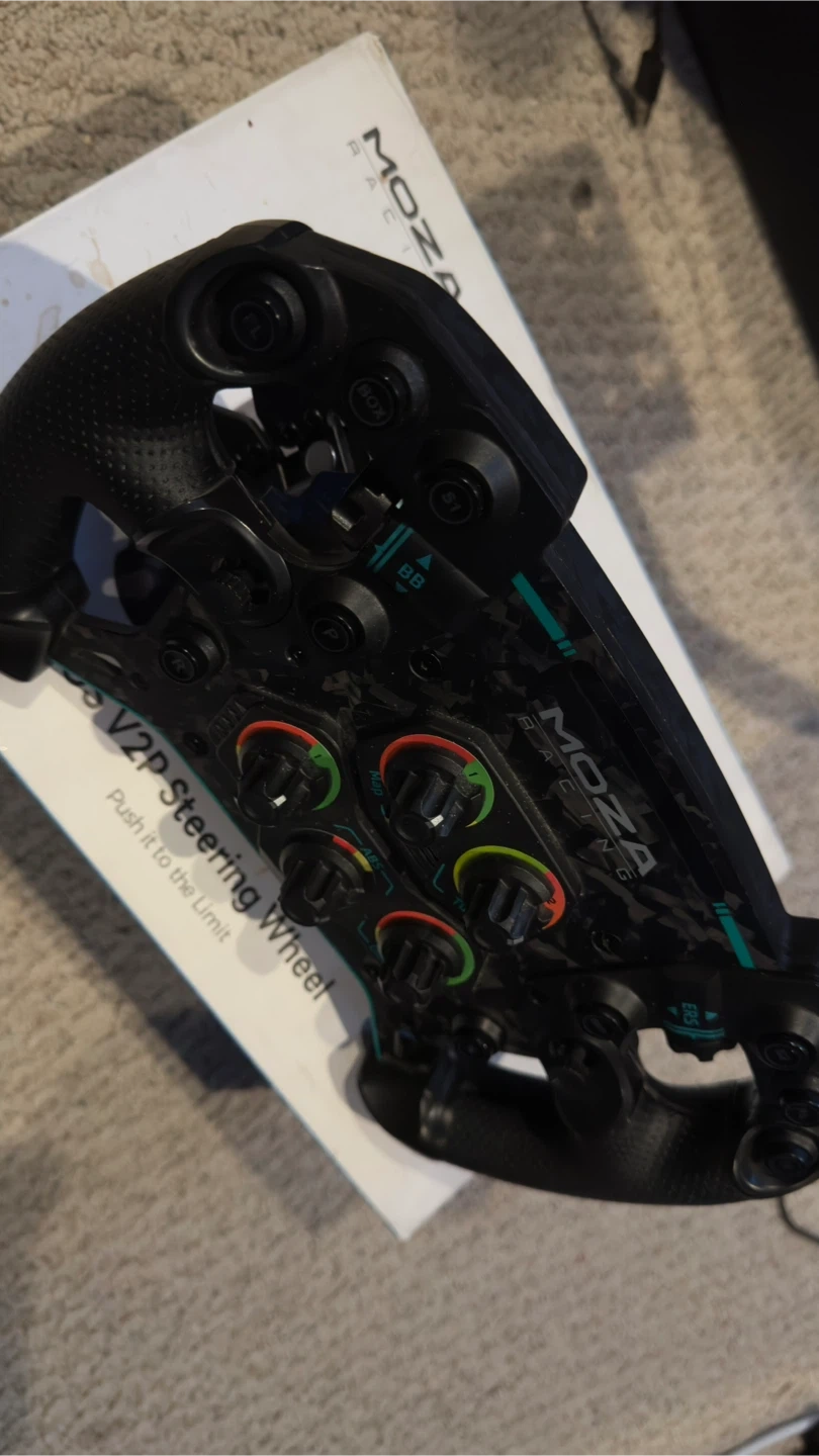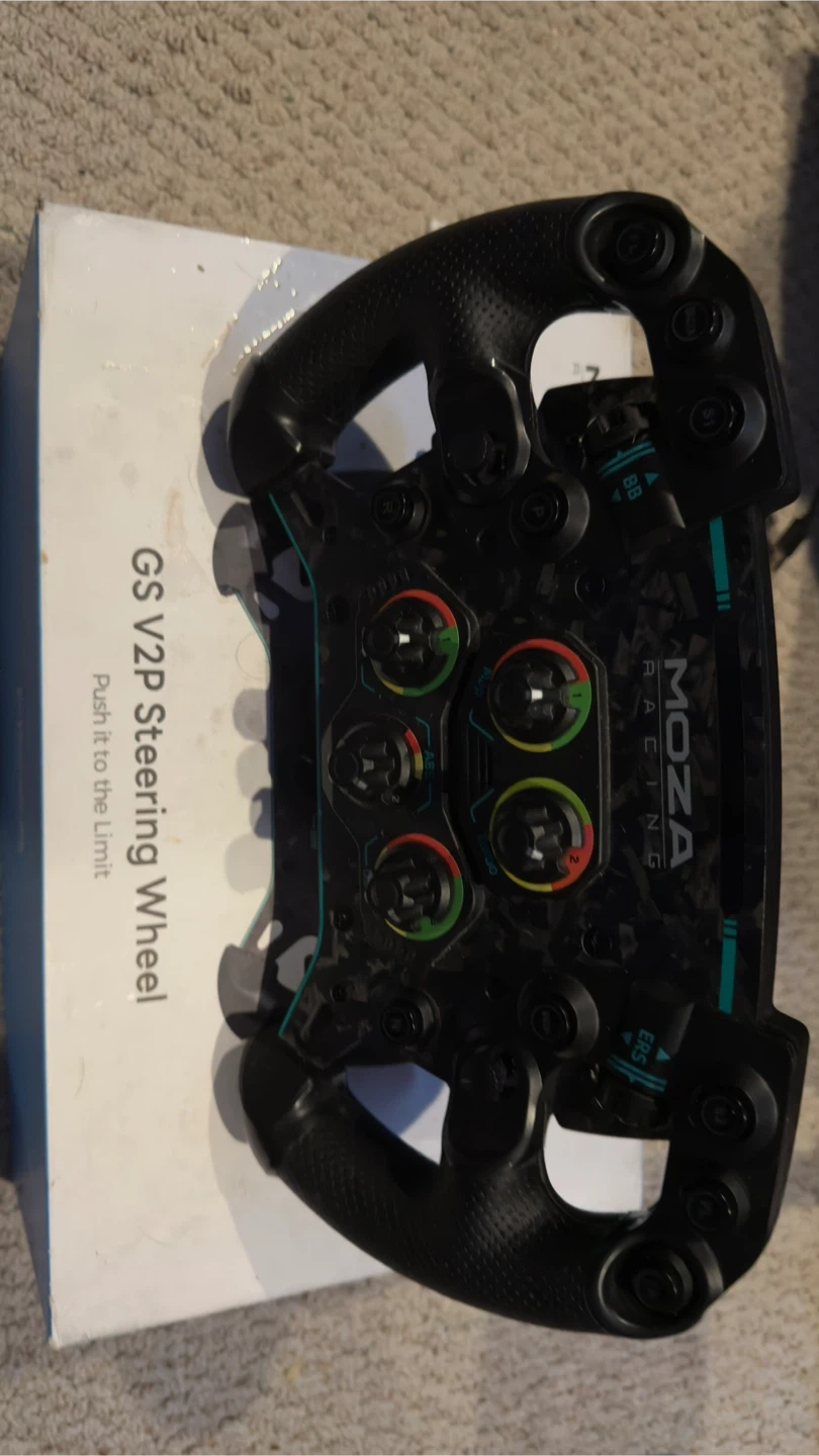 MOZA Racing GS V2P Steering Wheel. Features a carbon fibre pattern and multiple buttons with coloured accents. It's a sim racing wheel.
