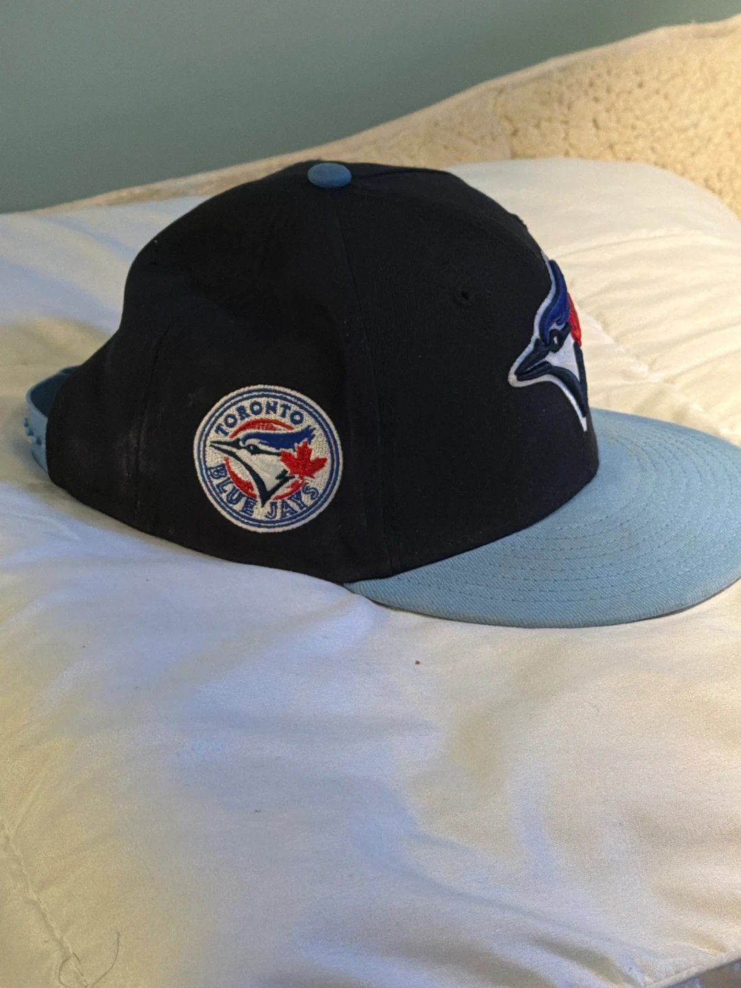 This is a Toronto Blue Jays baseball cap. It's a New Era 59FIFTY fitted hat with a black crown and a light blue brim. The front features the iconic Blue Jays logo, and the side has a "Toronto Blue Jays" patch. A great hat for any Jays fan!