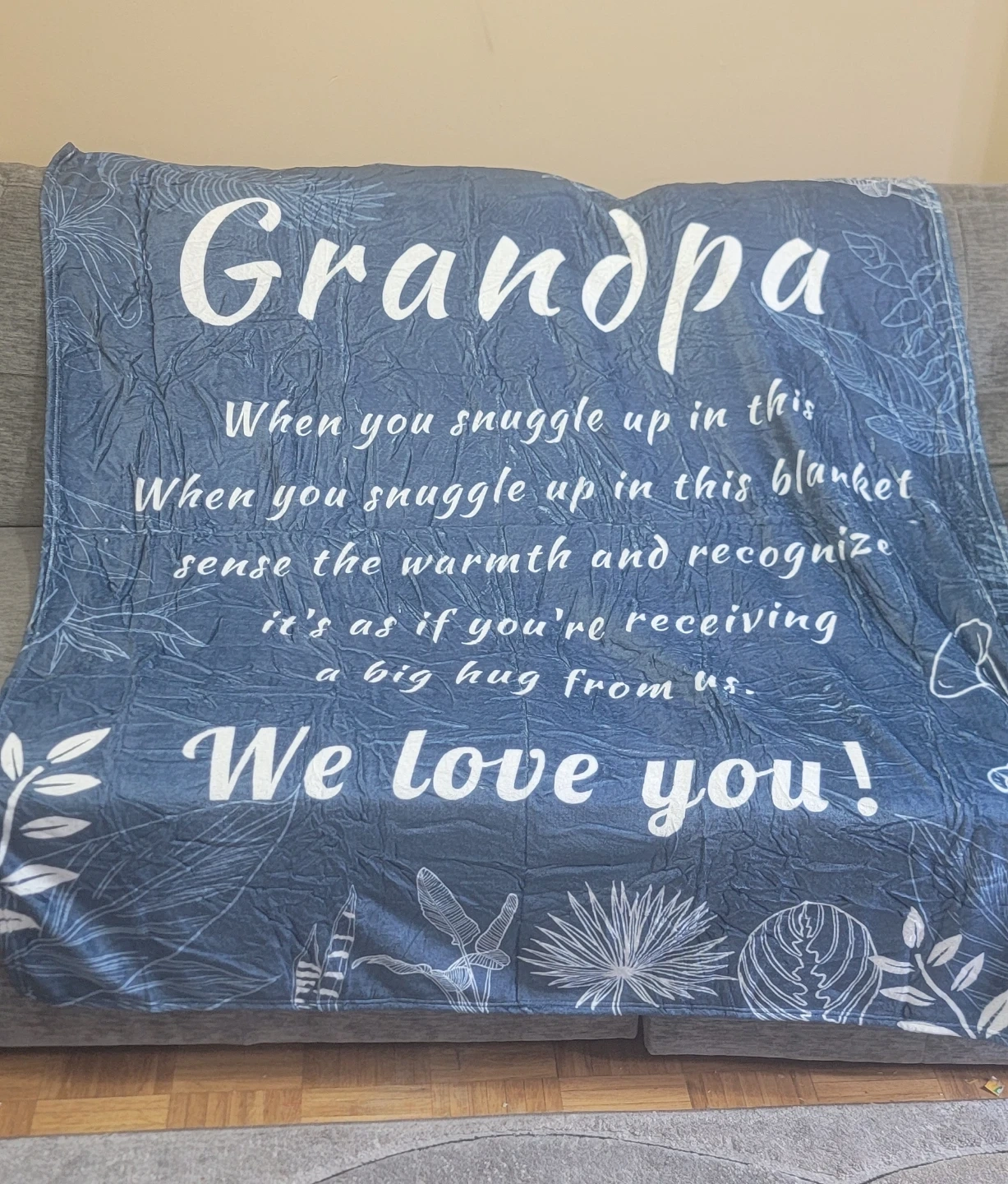 A blue throw blanket with a sentimental message for Grandpa. It reads, "When you snuggle up in this blanket sense the warmth and recognize it's as if you're receiving a big hug from us. We love you!". The design includes botanical prints and dragonflies. It's made of soft material perfect for cozying up.