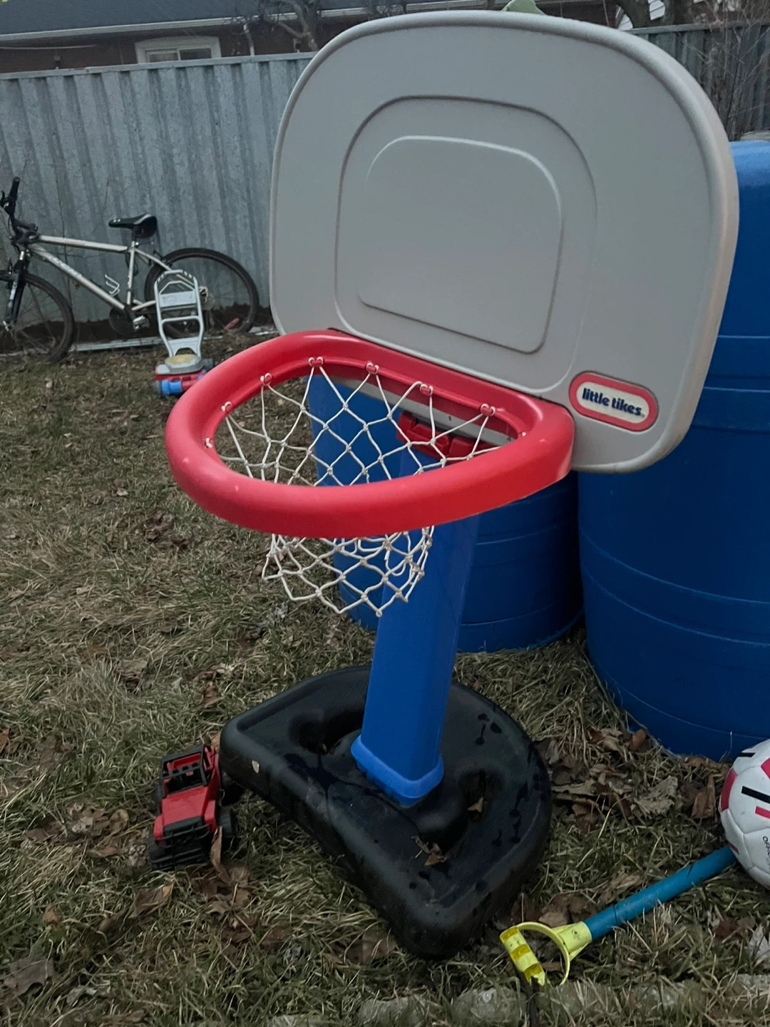 This is a Little Tikes adjustable basketball hoop. It's blue and red with a grey backboard and net. Great for little ones learning to play ball!