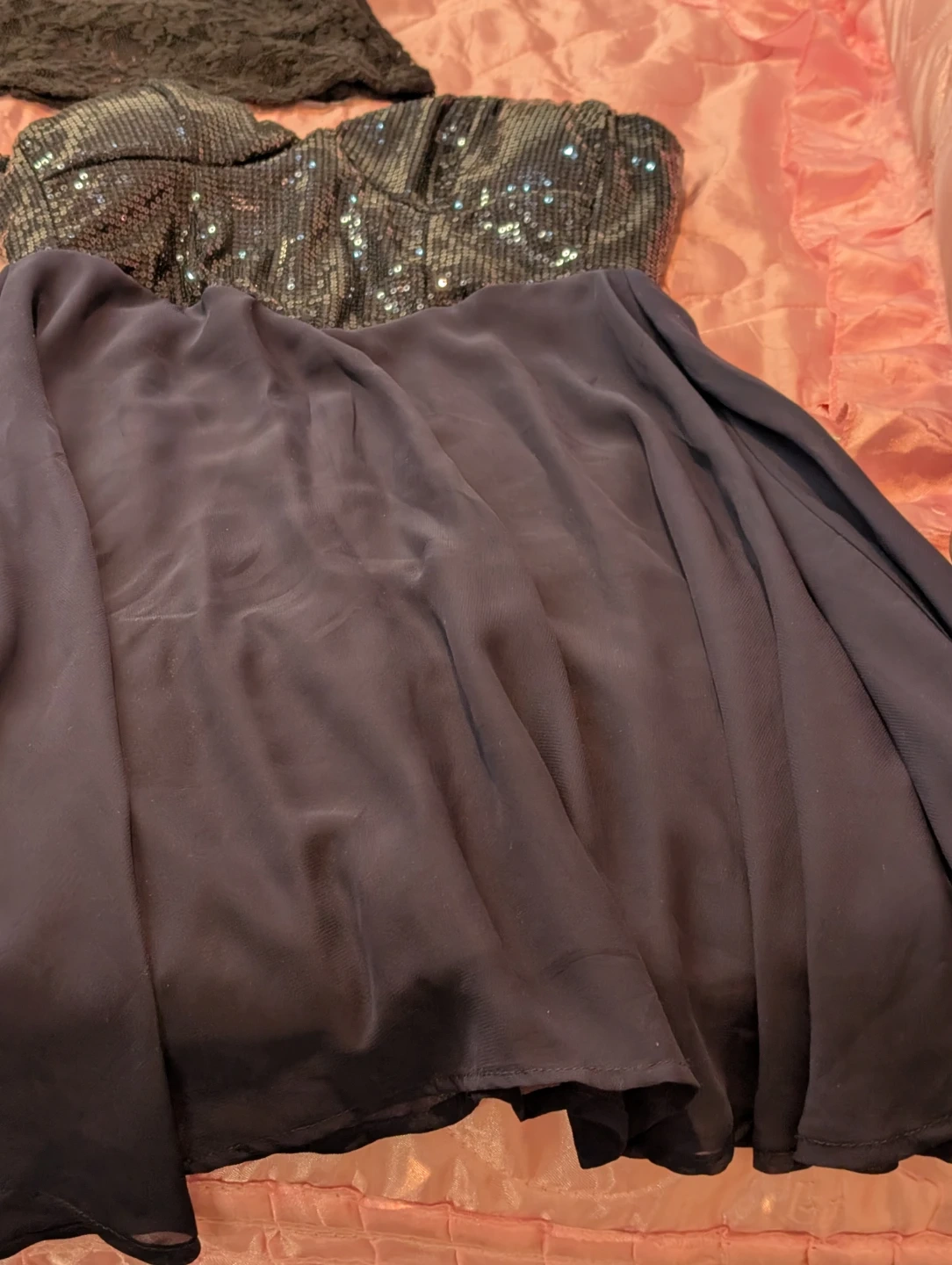 Bundle of five women's dresses. Includes a blue skater dress, a black lace dress with grommet detail, a navy sequined mini dress, a black floral print dress, and a cream lace-trimmed dress. Various styles and materials.