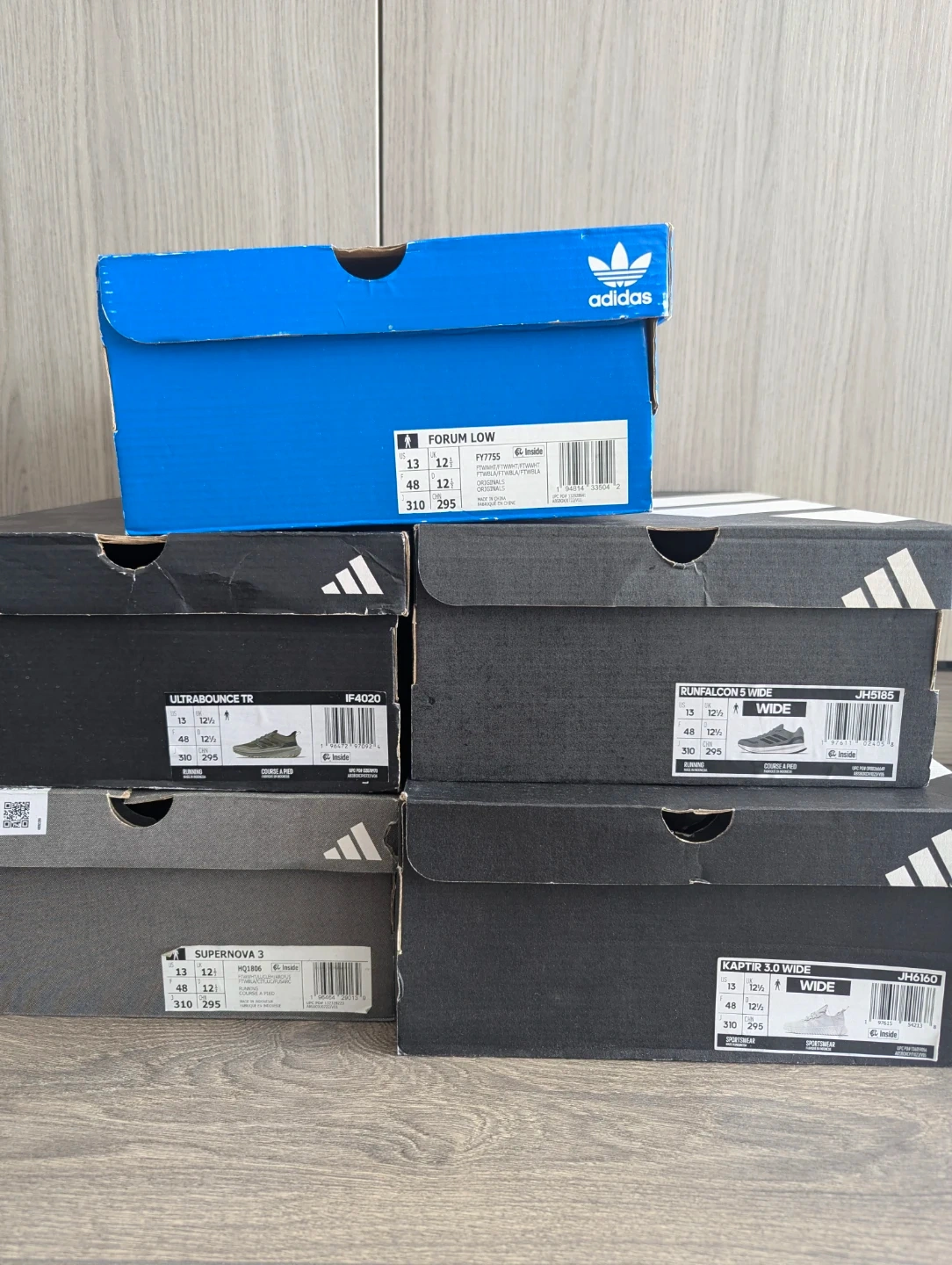 Adidas various shoes. Shoes come in size 13 US, 12.5 UK, 48 EU. Besides the Forum Low others were either worn once or are new. Just want them to have a use and not go to waste. Price is for each pair not all 5.