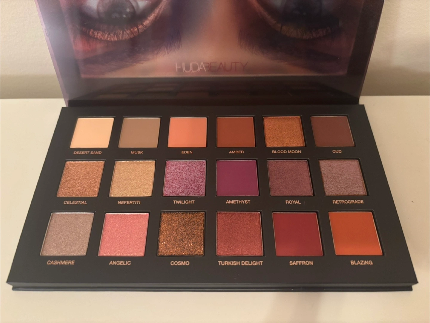Selling a Huda Beauty Desert Dusk eyeshadow palette! It features 18 eyeshadows in ready-to-layer textures, including buttery mattes, pressed pearls, and duo-chrome toppers. Create your own unique look with this high-pigment, easy-to-blend palette