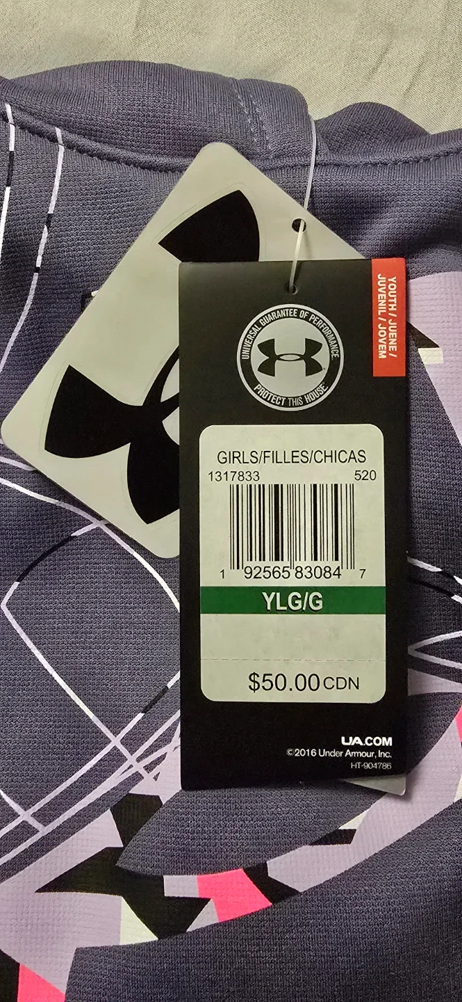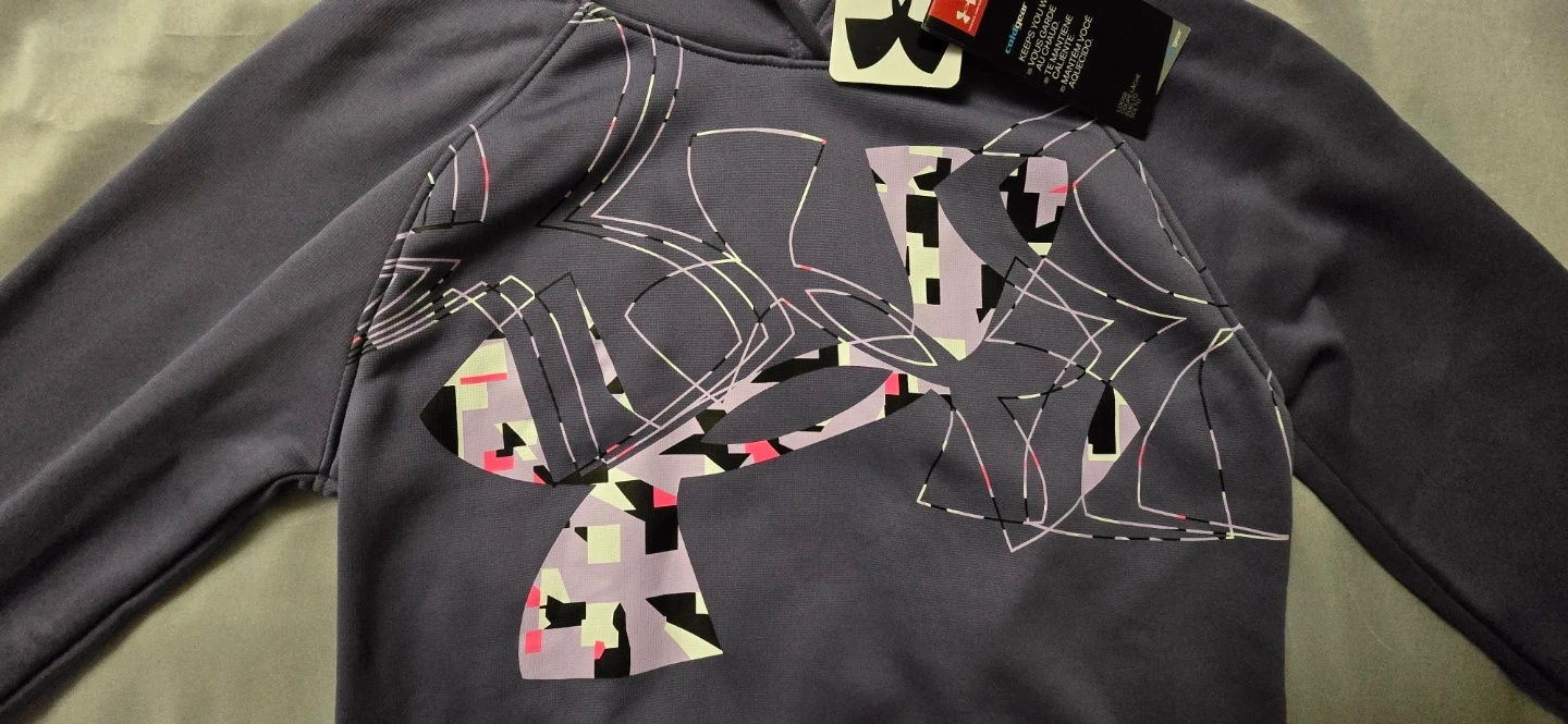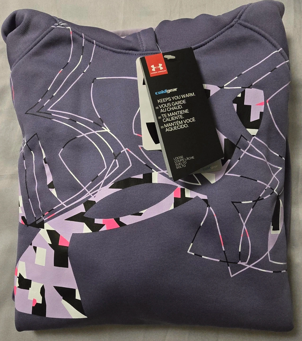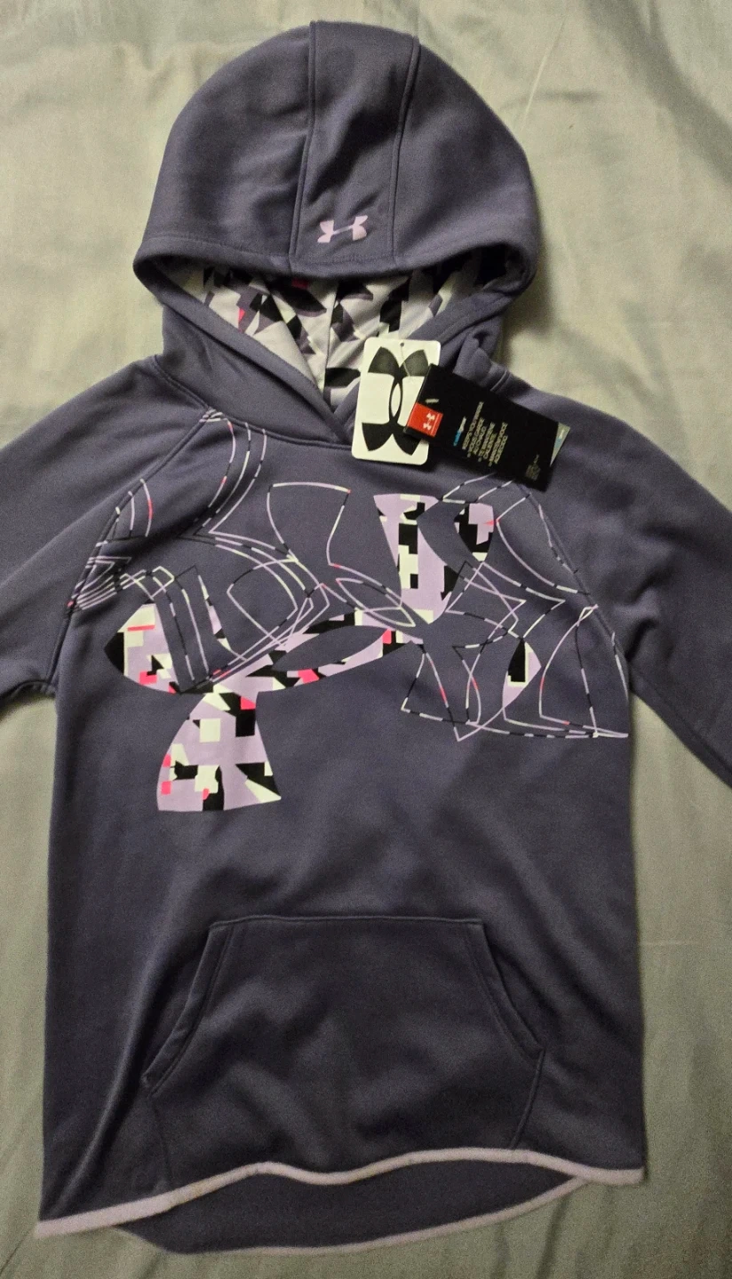 Brand new with tags, Girl's Purple Under Armour hoodie with Coolgear technology! It's a lovely shade of purple with a cool design on the front and a fun pattern inside the hood. Perfect for staying cozy!