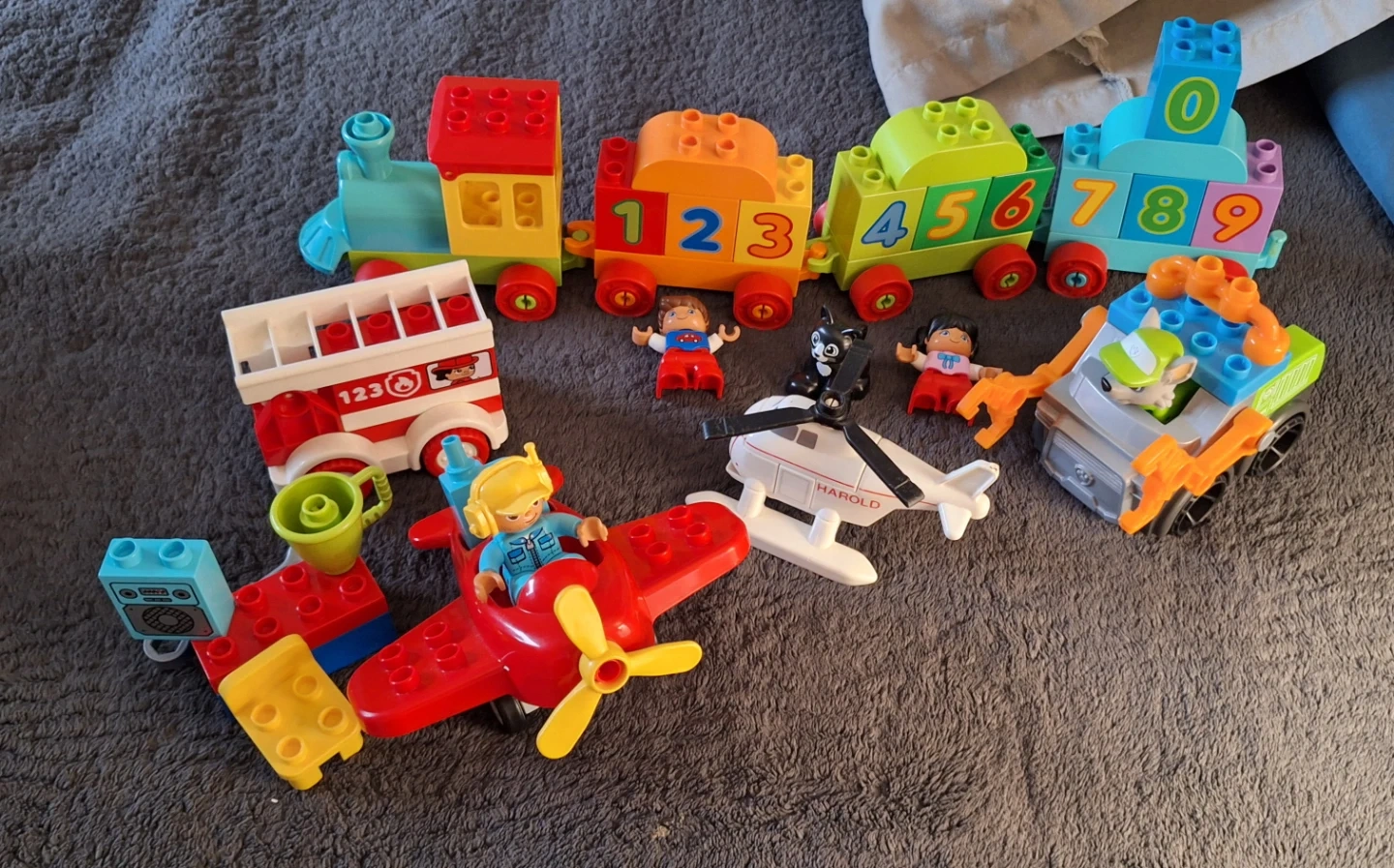 Selling a LEGO DUPLO set with various vehicles and figures! Includes a train, fire truck, airplane, helicopter, and other fun pieces. Perfect for toddlers and young children to explore their creativity and build amazing things