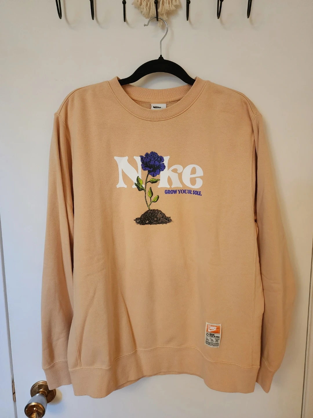 Selling a Nike crewneck sweatshirt in size L. It's a nice peach colour with a limited edition flower design. The material is soft and comfy, perfect for everyday wear. Please note, bought in Korea, size L may be more like a north American M.