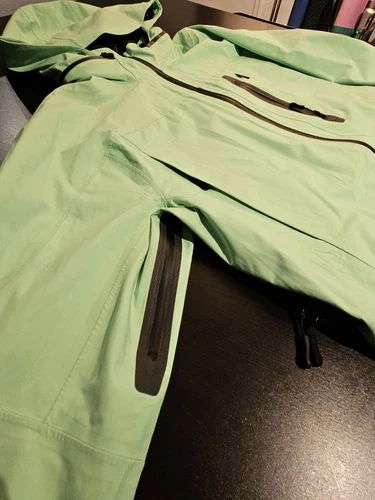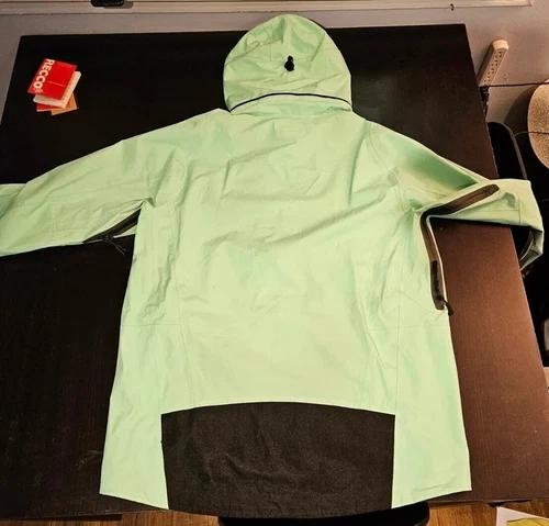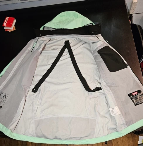 This high-quality Mint color ski shell jacket is perfect for any man who loves hitting the slopes. Designed with skiing in mind, this jacket is perfect for any winter sports. It great shell jacket for the rain as well. It was used for one season, no rips, no cuts of any kind. It's has minimal wear blemishes of use