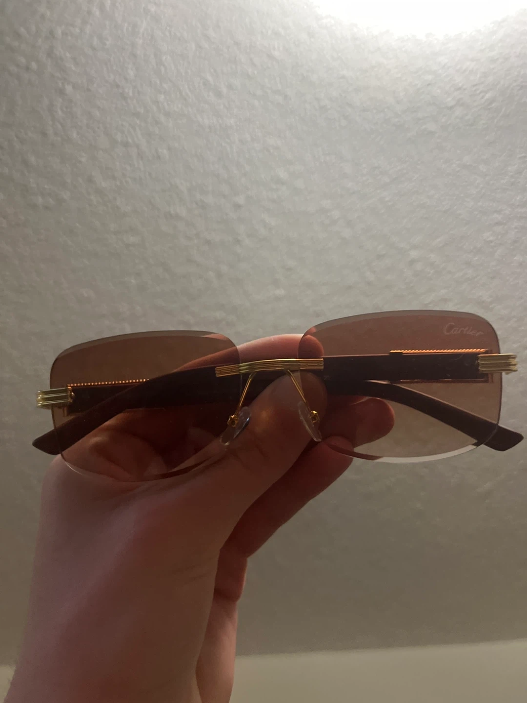 Selling a pair of sunglasses with brown gradient lenses. They have a gold-tone frame and the logo on the lens. They are in great condition!