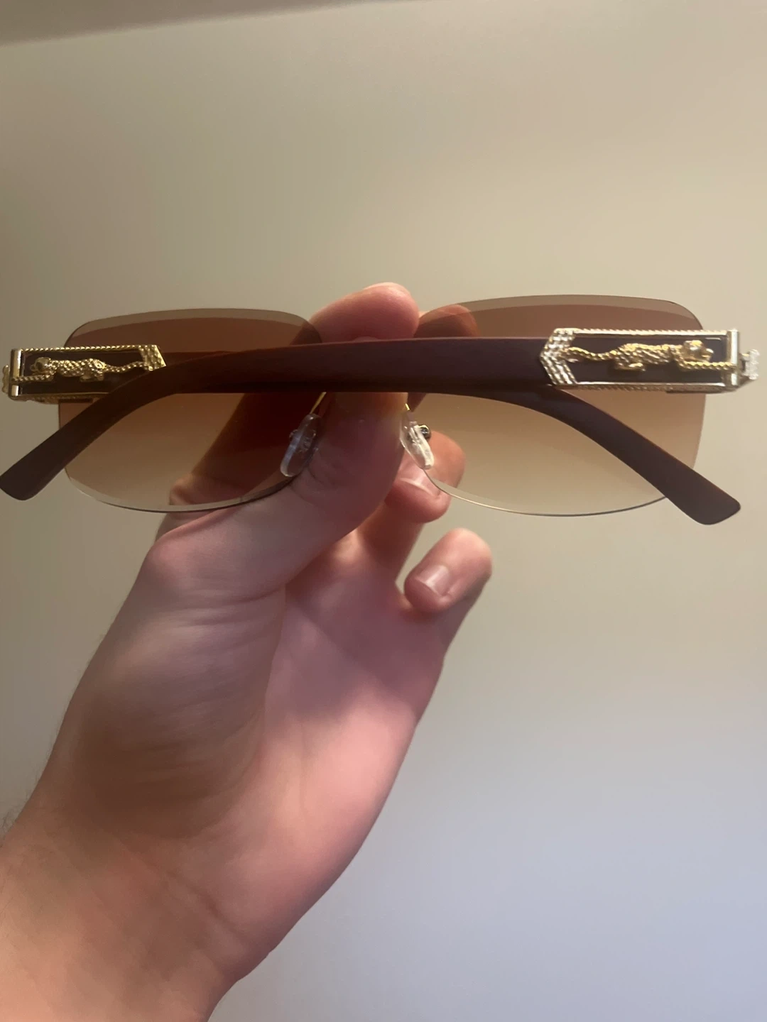 Selling a pair of sunglasses with brown gradient lenses. They have a gold-tone frame and the logo on the lens. They are in great condition!